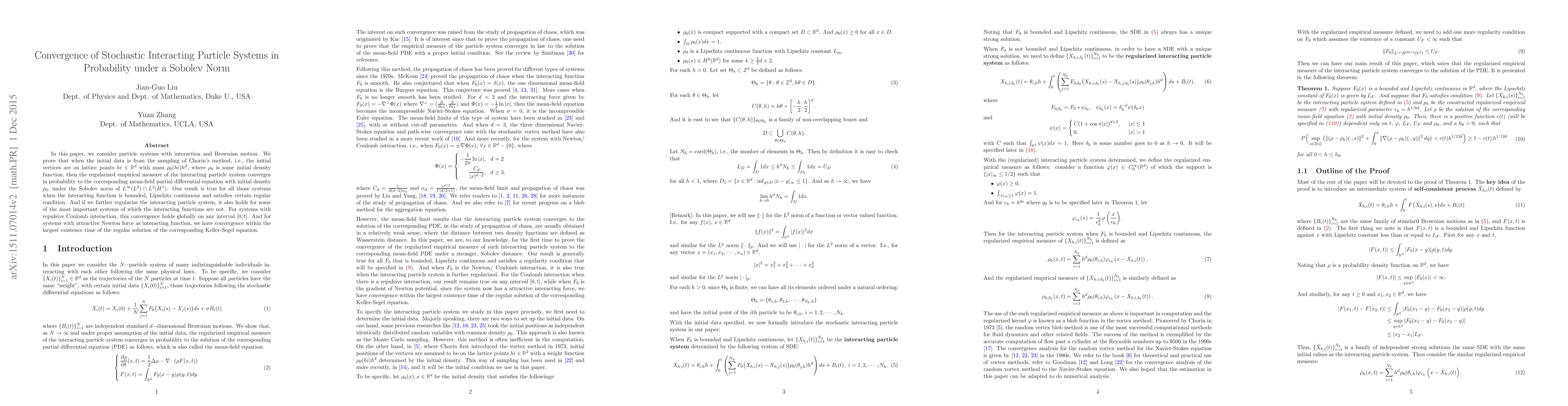 This paper proves the convergence of stochastic interacting particle systems to mean-field partial differential equations under a Sobolev norm, showing that regularized empirical measures converge to the corresponding PDEs when initial data is sampled from Chorin's method. The result holds for bounded, Lipschitz continuous interaction functions and extends to systems with repulsive Coulomb interaction and attractive Newton force interactions.
