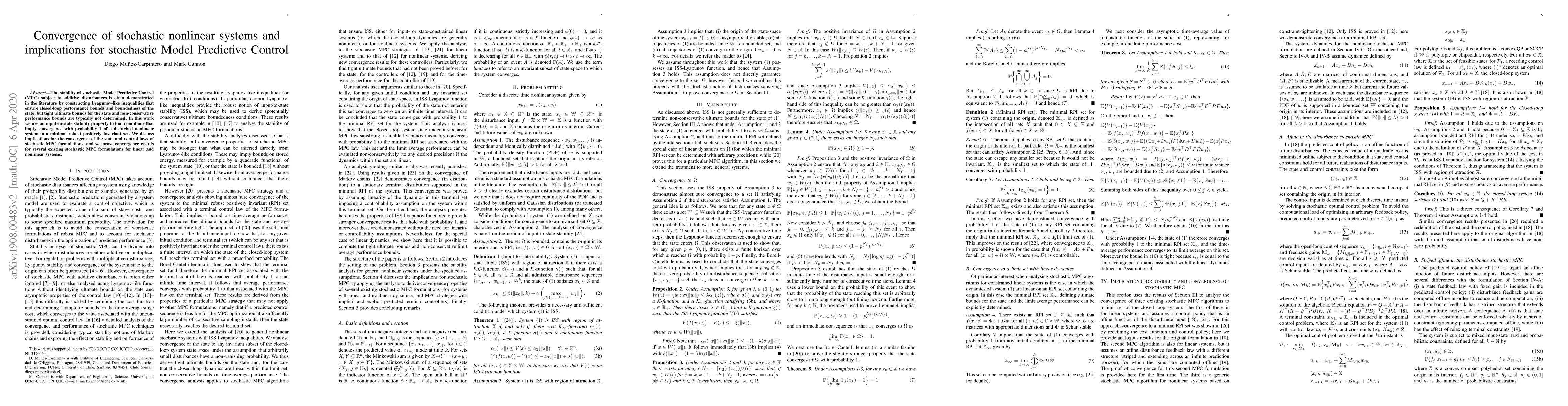 This paper investigates the convergence of stochastic nonlinear systems under Model Predictive Control (MPC) by establishing conditions that ensure convergence with probability 1. It uses input-to-state stability to derive robust positively invariant sets and discusses implications for stochastic MPC, proving convergence results for various formulations.