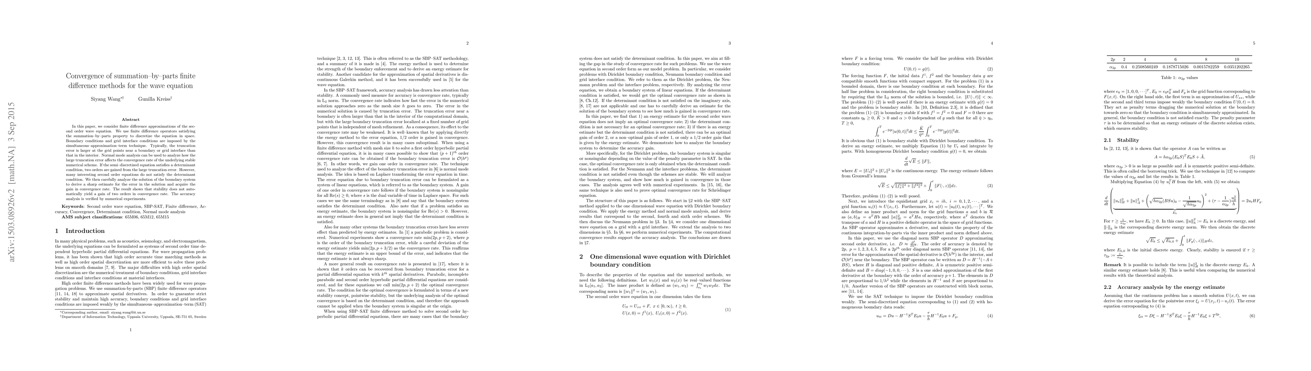 This paper investigates finite difference methods for the wave equation using summation-by-parts operators, focusing on convergence rates affected by large truncation errors near boundaries. It shows that while stability can improve convergence, not all equations benefit from a two-order gain, and a detailed analysis of boundary conditions is necessary.