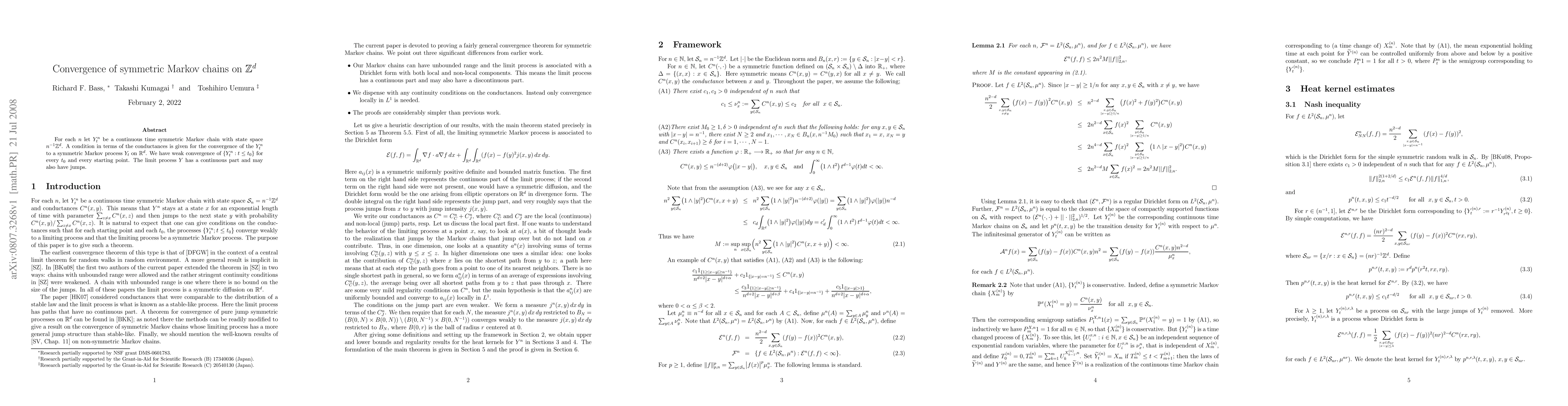 Research shows that continuous time symmetric Markov chains on $\Z^d$ converge to a symmetric Markov process on $\R^d$, with convergence proven through weak limits for every starting point and time interval.