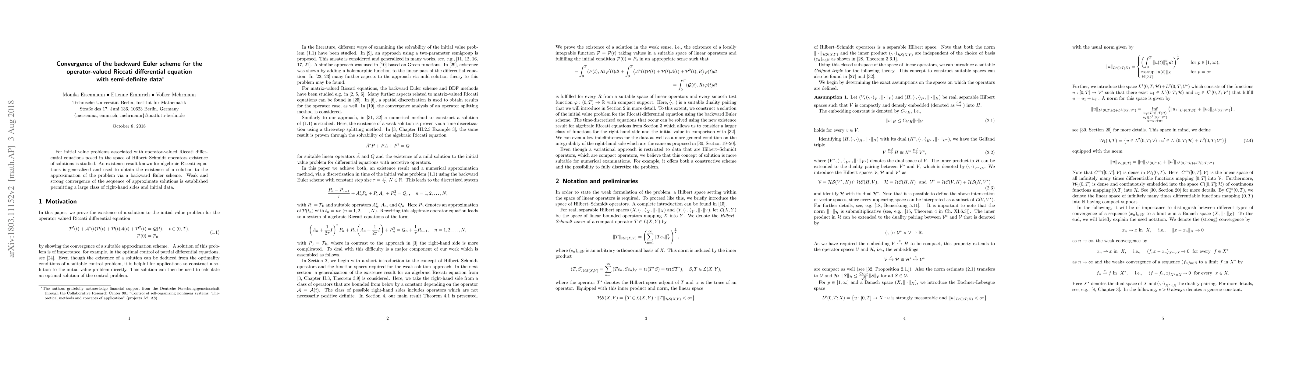 This paper studies the convergence of the backward Euler scheme for operator-valued Riccati differential equations in Hilbert-Schmidt space. It establishes both weak and strong convergence of the approximate solutions, generalizing results from algebraic Riccati equations to a broader class of semi-definite data.