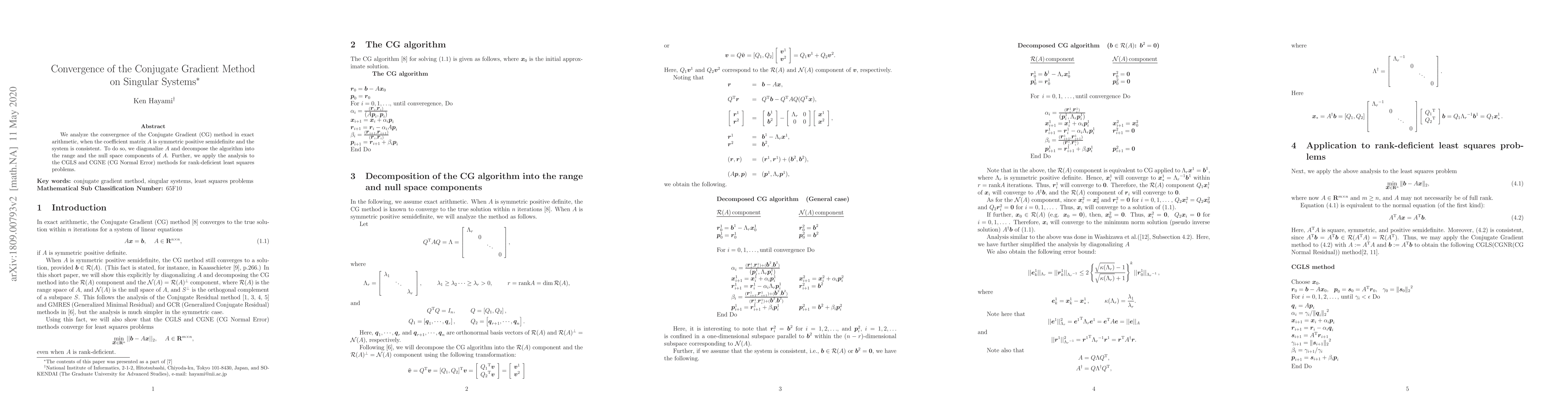 The Conjugate Gradient method converges on singular systems with symmetric positive semidefinite matrices in exact arithmetic. Its convergence is analyzed by decomposing the algorithm into range and null space components.
