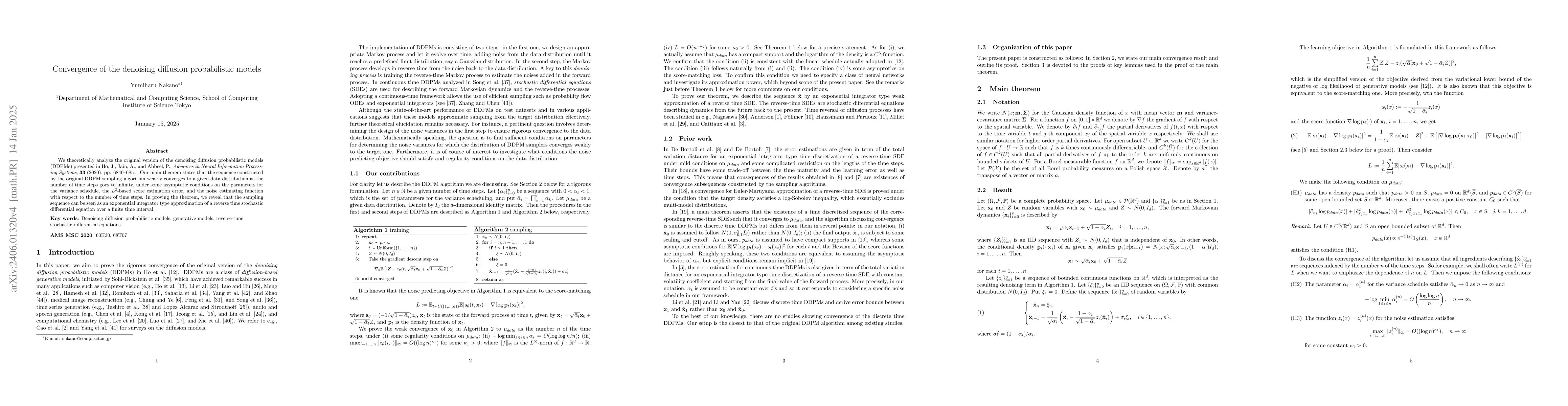 This paper theoretically analyzes the convergence of the original denoising diffusion probabilistic models (DDPMs), proving that the sampling sequence weakly converges to the data distribution as the number of steps tends to infinity, under specific conditions. The authors also rigorously define the backward Itô integral for continuous processes and establish the reverse time representation of stochastic differential equations.