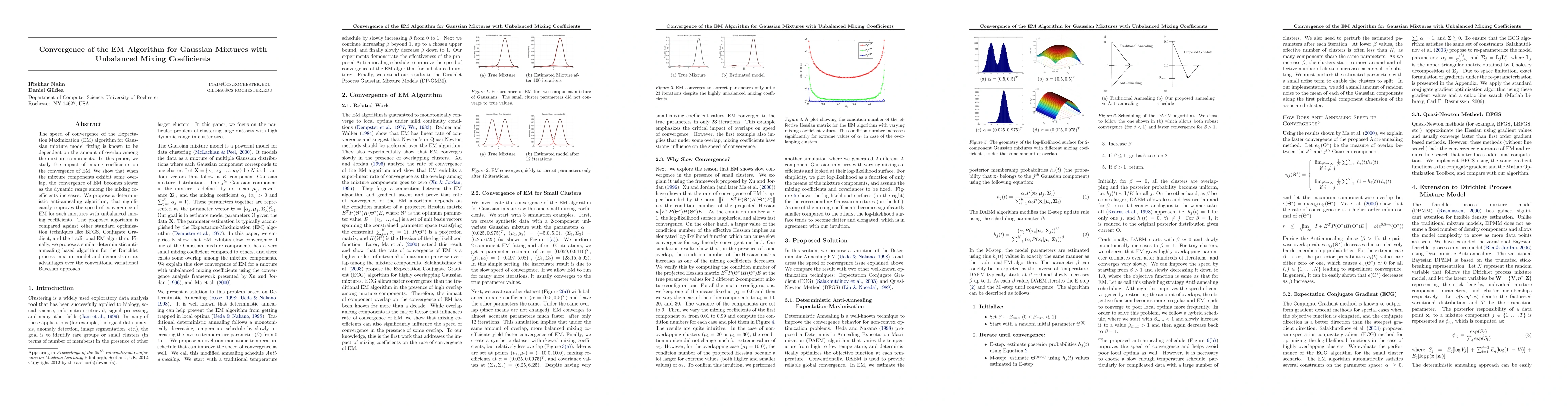 This paper investigates the convergence speed of the EM algorithm for Gaussian mixture models with unbalanced mixing coefficients, demonstrating that increased dynamic range among coefficients slows convergence. It proposes a deterministic anti-annealing algorithm to improve EM's speed and compares it to BFGS, Conjugate Gradient, and traditional EM, also extending the approach to Dirichlet process mixtures.