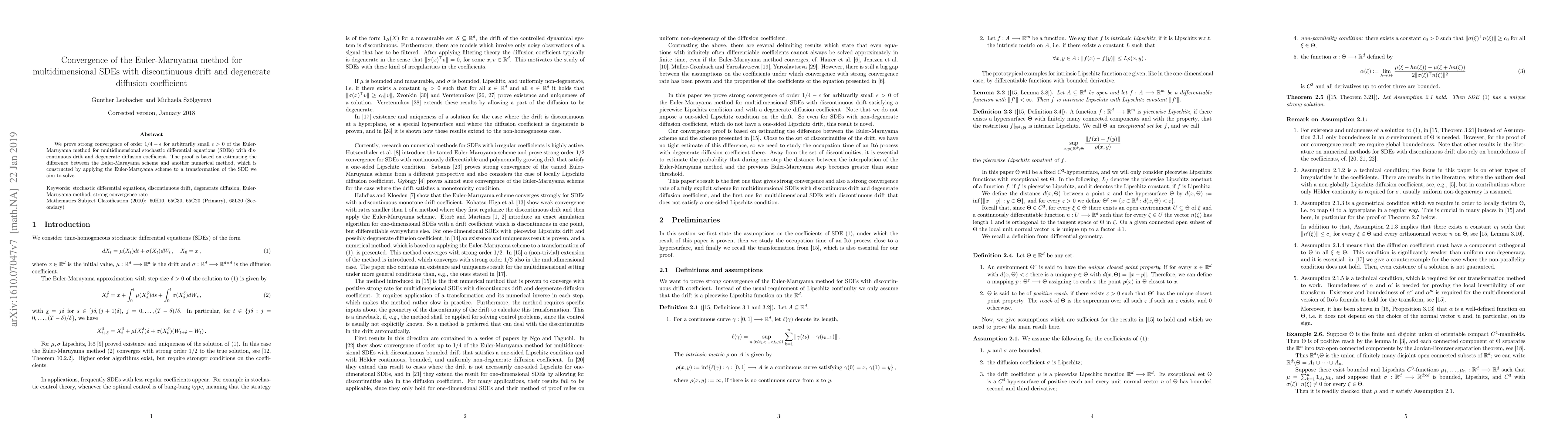 This paper proves strong convergence of the Euler-Maruyama method to solve multidimensional SDEs with discontinuous drift and degenerate diffusion, achieving order $1/4-\epsilon$ for any small $\epsilon > 0$. The proof leverages a comparison with another numerical method derived from a transformed SDE.