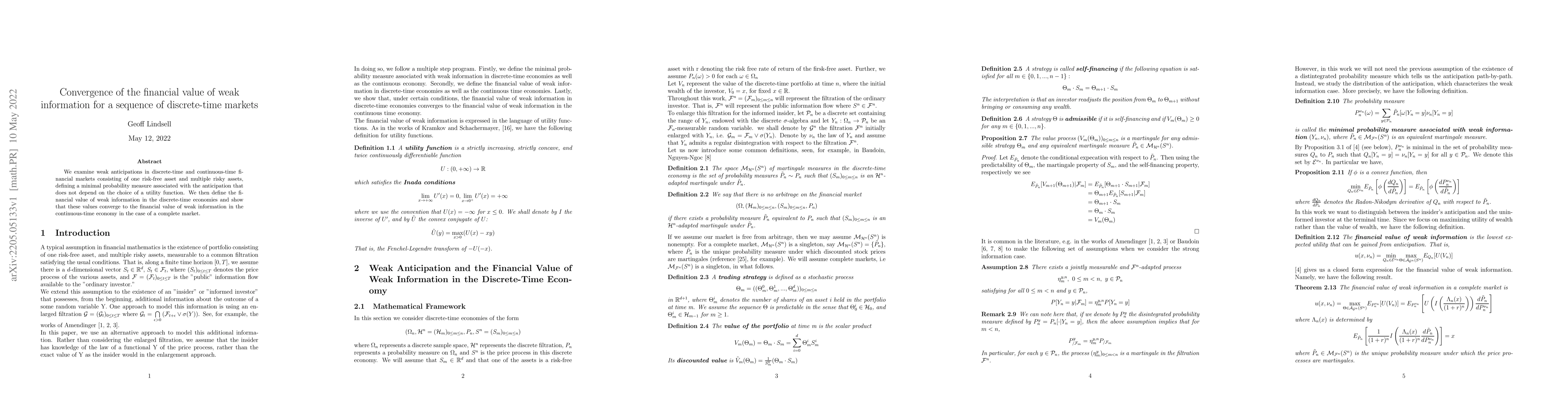 We examine weak anticipations in discrete-time and continuous-time financial markets consisting of one risk-free asset and multiple risky assets, defining a minimal probability measure associated with the anticipation that does not depend on the choice of a utility function. We then define the financial value of weak information in the discrete-time economies and show that these values converge to the financial value of weak information in the continuous-time economy in the case of a complete market.