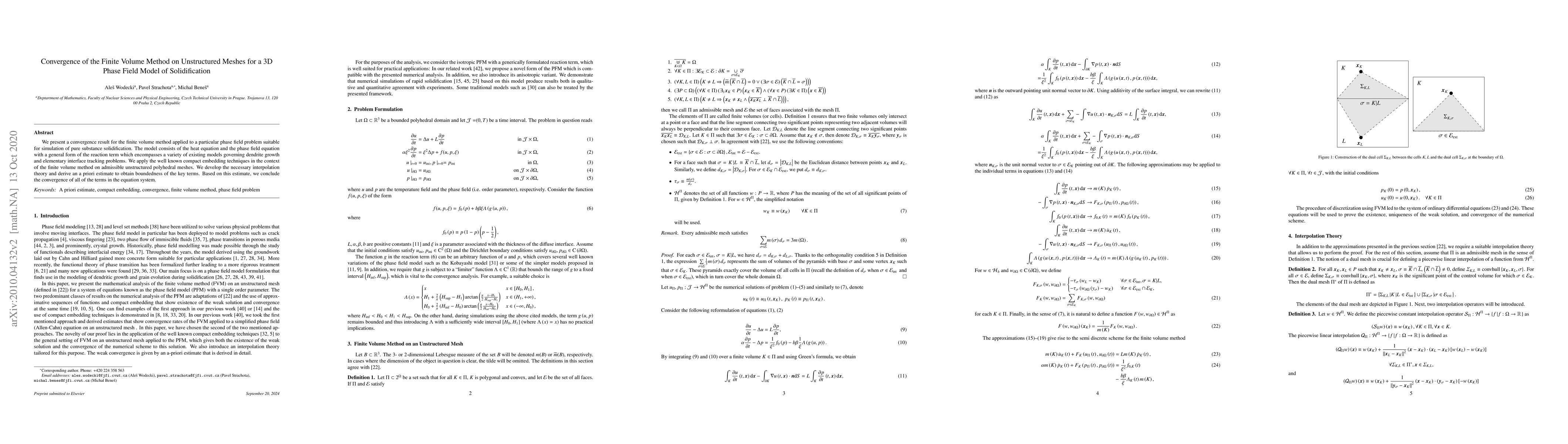 We present a convergence result for the finite volume method applied to a particular phase field problem suitable for simulation of pure substance solidification. The model consists of the heat equation and the phase field equation with a general form of the reaction term which encompasses a variety of existing models governing dendrite growth and elementary interface tracking problems. We apply the well known compact embedding techniques in the context of the finite volume method on admissible unstructured polyhedral meshes. We develop the necessary interpolation theory and derive an a priori estimate to obtain boundedness of the key terms. Based on this estimate, we conclude the convergence of all of the terms in the equation system.