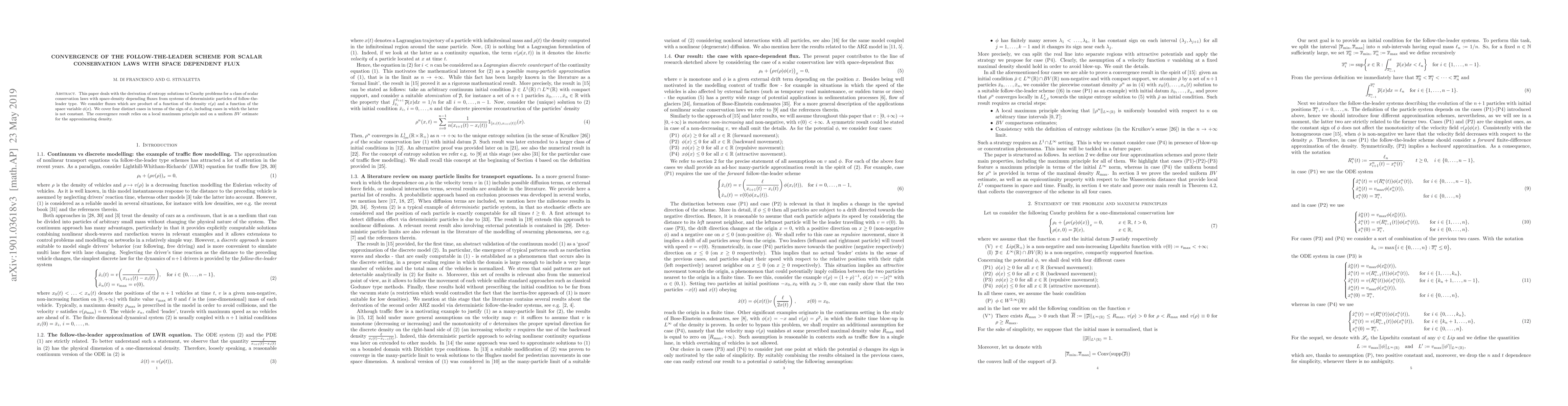 This paper deals with the derivation of entropy solutions to Cauchy problems for a class of scalar conservation laws with space-density depending fluxes from systems of deterministic particles of follow-the-leader type. We consider fluxes which are product of a function of the density $v(\rho)$ and a function of the space variable $\phi(x)$. We cover four distinct cases in terms of the sign of $\phi$, including cases in which the latter is not constant. The convergence result relies on a local maximum principle and on a uniform $BV$ estimate for the approximating density.