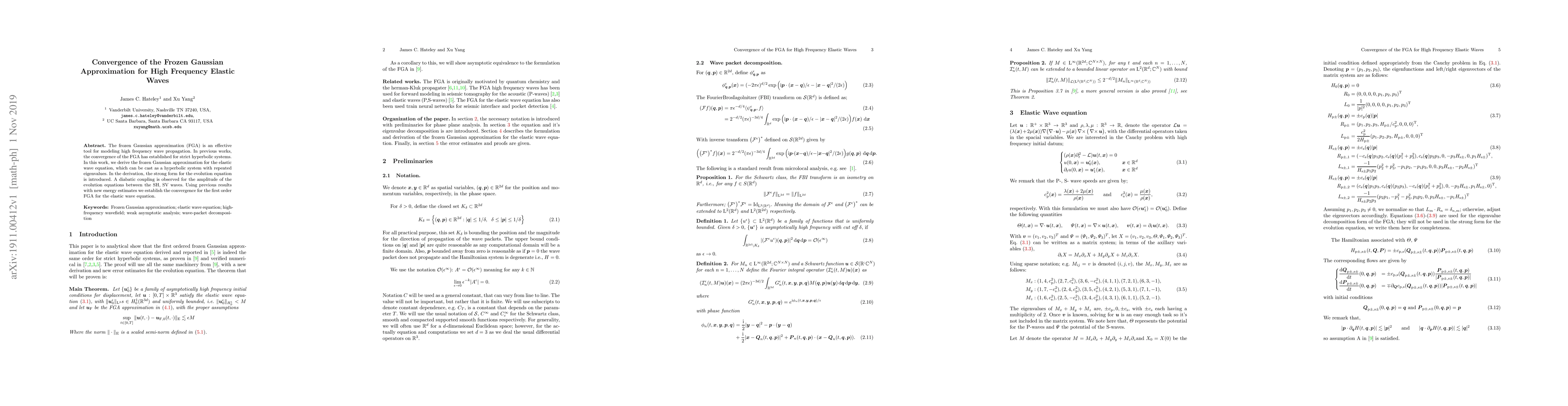 This paper derives the frozen Gaussian approximation (FGA) for the elastic wave equation, establishing its convergence for high frequency wave propagation. It introduces a strong form for the evolution equation and uses new energy estimates to confirm the convergence of the first order FGA, observing diabatic coupling between SH and SV wave amplitudes.