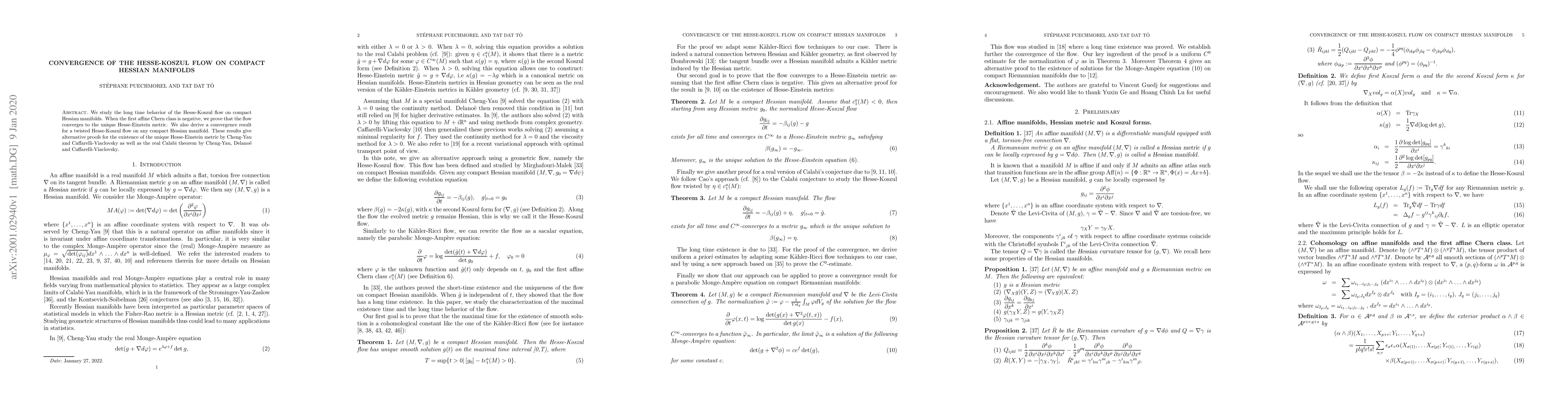 We study the long time behavior of the Hesse-Koszul flow on compact Hessian manifolds. When the first affine Chern class is negative, we prove that the flow converges to the unique Hesse-Einstein metric. We also derive a convergence result for a twisted Hesse-Koszul flow on any compact Hessian manifold. These results give alternative proofs for the existence of the unique Hesse-Einstein metric by Cheng-Yau and Caffarelli-Viaclovsky as well as the real Calabi theorem by Cheng-Yau, Delano\"e and Caffarelli-Viaclovsky.
