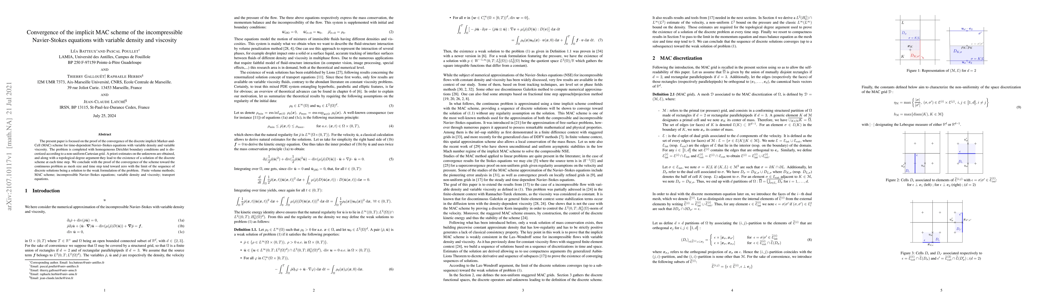 The present paper is focused on the proof of the convergence of the discrete implicit Marker-and-Cell (MAC) scheme for time-dependent Navier--Stokes equations with variable density and variable viscosity. The problem is completed with homogeneous Dirichlet boundary conditions and is discretized according to a non-uniform Cartesian grid. A priori-estimates on the unknowns are obtained, and along with a topological degree argument they lead to the existence of a solution of the discrete scheme at each time step. We conclude with the proof of the convergence of the scheme toward the continuous problem as mesh size and time step tend toward zero with the limit of the sequence of discrete solutions being a solution to the weak formulation of the problem.