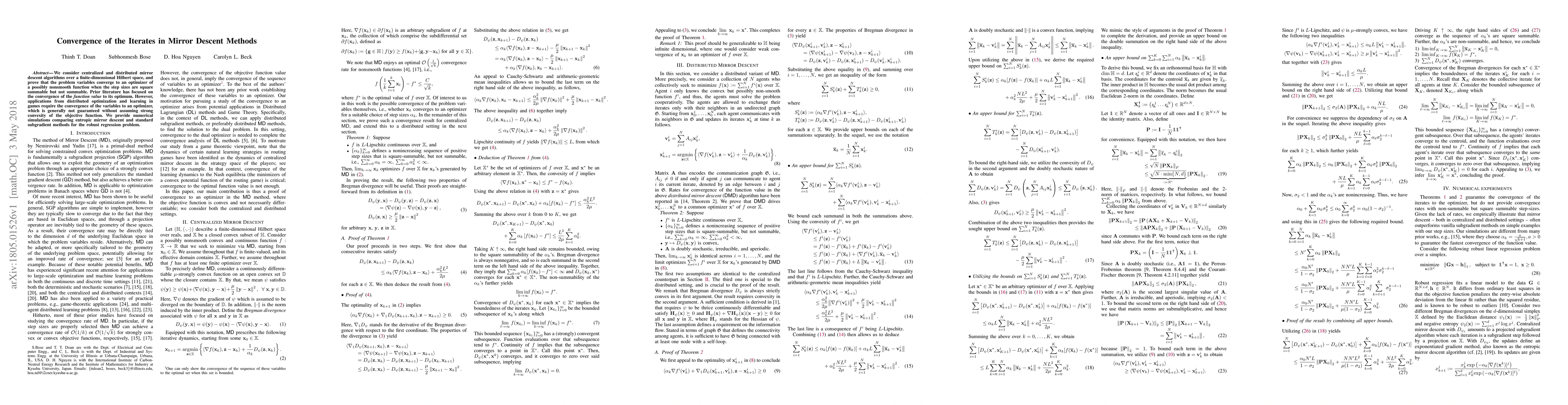 This paper proves the convergence of iterates in centralized and distributed mirror descent methods to an optimizer of a possibly nonsmooth function, under square summable but not necessarily summable step sizes. It contrasts with prior work focusing on function value convergence, addressing the need for variable convergence in distributed optimization and game learning scenarios. Numerical simulations compare entropic mirror descent with standard subgradient methods for robust regression.