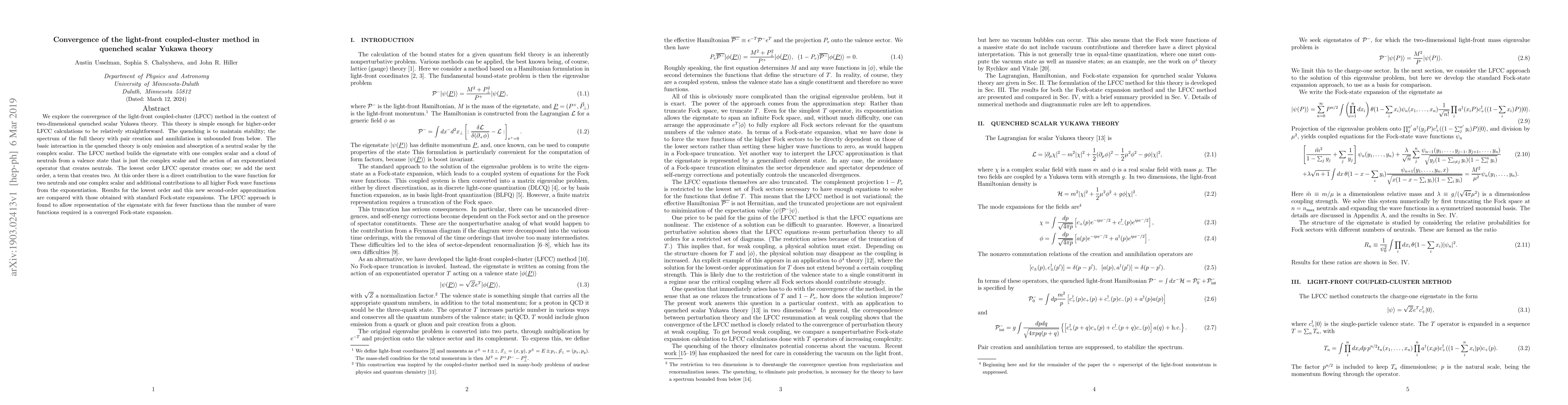 This paper investigates the convergence of the light-front coupled-cluster (LFCC) method in two-dimensional quenched scalar Yukawa theory, demonstrating that it requires fewer functions to represent the eigenstate compared to standard Fock-state expansions. The LFCC method's second-order approximation shows significant improvements over the lowest order, highlighting its efficiency.