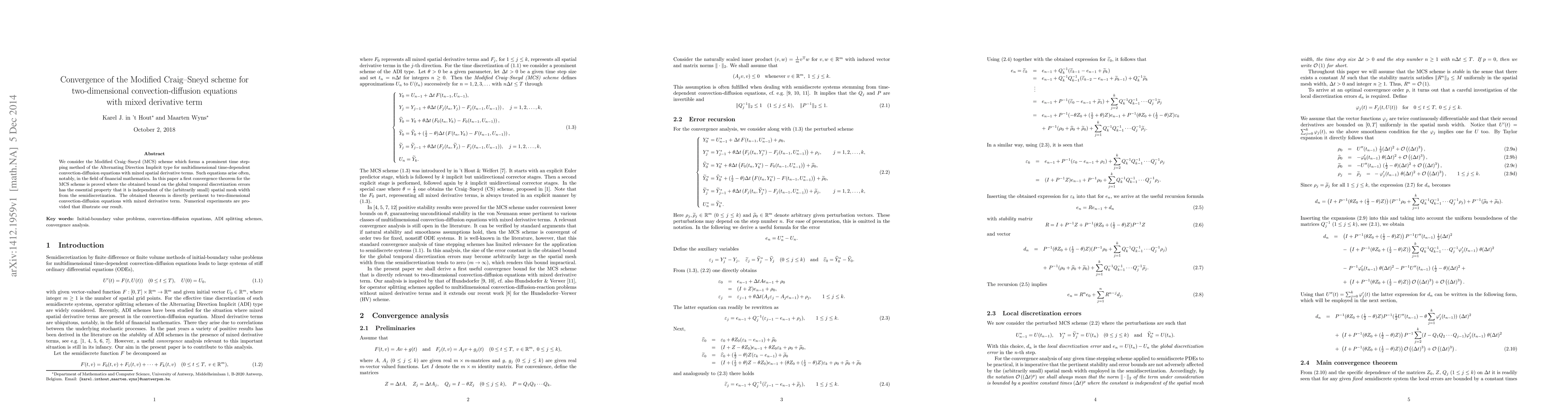 This paper proves the first convergence theorem for the Modified Craig-Sneyd (MCS) scheme, demonstrating its effectiveness for solving two-dimensional convection-diffusion equations with mixed derivative terms. The convergence bound is shown to be independent of the spatial mesh width, highlighting the scheme's robustness.