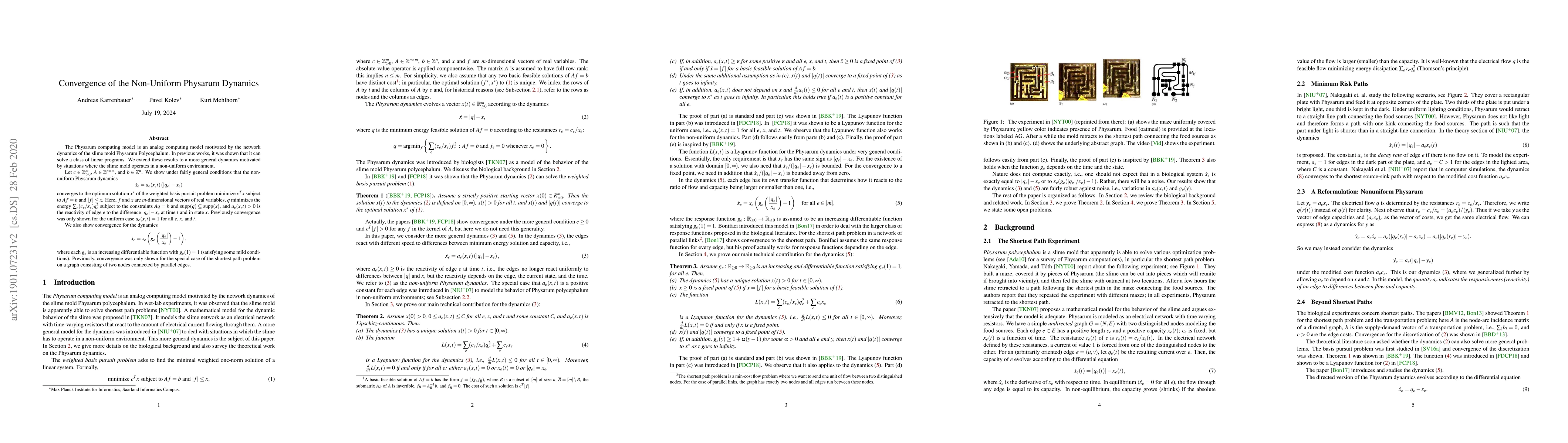 Let $c \in \mathbb{Z}^m_{> 0}$, $A \in \mathbb{Z}^{n\times m}$, and $b \in \mathbb{Z}^n$. We show under fairly general conditions that the non-uniform Physarum dynamics \[ \dot{x}_e = a_e(x,t) \left(|q_e| - x_e\right) \] converges to the optimum solution $x^*$ of the weighted basis pursuit problem minimize $c^T x$ subject to $A f = b$ and $|f| \le x$. Here, $f$ and $x$ are $m$-vectors of real variables, $q$ minimizes the energy $\sum_e (c_e/x_e) q_e^2$ subject to the constraints $A q = b$ and $\mathrm{supp}(q) \subseteq \mathrm{supp}(x)$, and $a_e(x,t) > 0$ is the reactivity of edge $e$ to the difference $|q_e| - x_e$ at time $t$ and in state $x$. Previously convergence was only shown for the uniform case $a_e(x,t) = 1$ for all $e$, $x$, and $t$. We also show convergence for the dynamics \[ \dot{x}_e = x_e \cdot \left( g_e \left(\frac{|q_e|}{x_e}\right) - 1\right),\] where $g_e$ is an increasing differentiable function with $g_e(1) = 1$. Previously convergence was only shown for the special case of the shortest path problem on a graph consisting of two nodes connected by parallel edges.