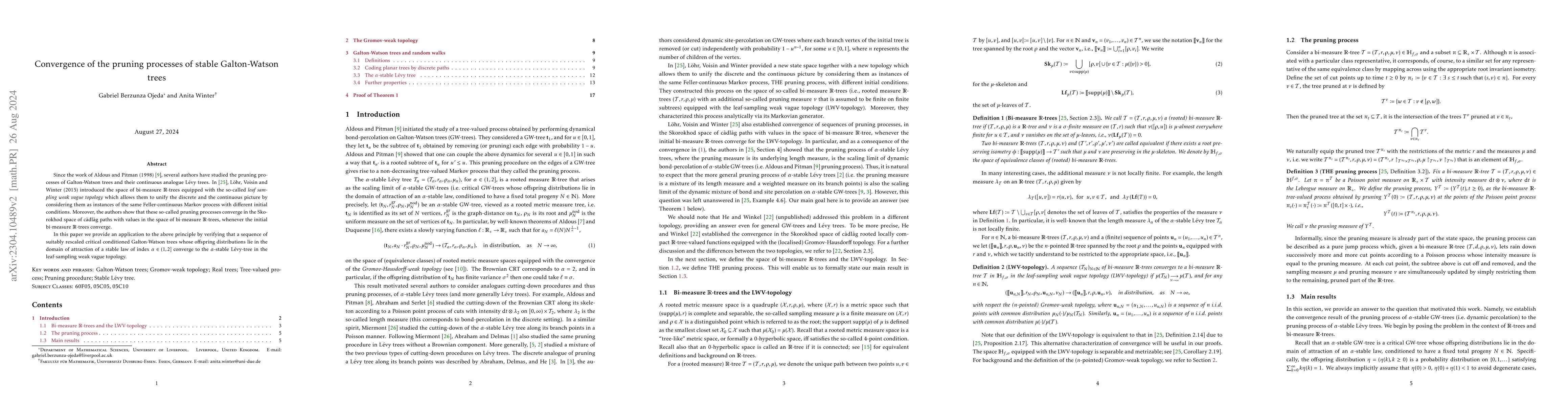 Since the work of Aldous and Pitman (1998), several authors have studied the pruning processes of Galton-Watson trees and their continuous analogue L\'evy trees. L\"ohr, Voisin and Winter (2015) introduced the space of bi-measure $\mathbb{R}$-trees equipped with the so-called leaf sampling weak vague topology which allows them to unify the discrete and the continuous picture by considering them as instances of the same Feller-continuous Markov process with different initial conditions. Moreover, the authors show that these so-called pruning processes converge in the Skorokhod space of c\`adl\`ag paths with values in the space of bi-measure $\mathbb{R}$-trees, whenever the initial bi-measure $\mathbb{R}$-trees converge. In this paper we first provide an example to the above principle by verifying that a sequence of suitably rescaled critical conditioned Galton-Watson trees whose offspring distributions lie in the domain of attraction of a stable law of index $\alpha \in (1,2]$ converge to the $\alpha$-stable L\'evy-tree in the leaf-sampling weak converge. Secondly, we strengthen the results of L\"ohr et al. (2015) and show that the convergence holds in the Skorokhod space of c\`adl\`ag (rooted measure) $\mathbb{R}$-tree-valued functions equipped with the Gromov-Hausdorff weak topology.