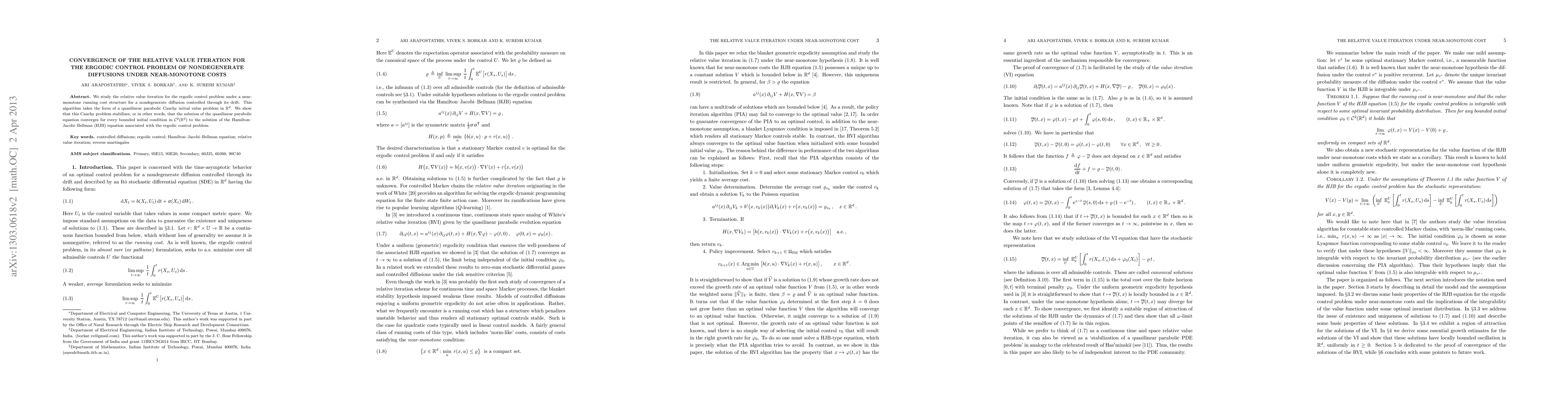 We study the relative value iteration for the ergodic control problem under a near-monotone running cost structure for a nondegenerate diffusion controlled through its drift. This algorithm takes the form of a quasilinear parabolic Cauchy initial value problem in $\RR^{d}$. We show that this Cauchy problem stabilizes, or in other words, that the solution of the quasilinear parabolic equation converges for every bounded initial condition in $\Cc^{2}(\RR^{d})$ to the solution of the Hamilton--Jacobi--Bellman (HJB) equation associated with the ergodic control problem.