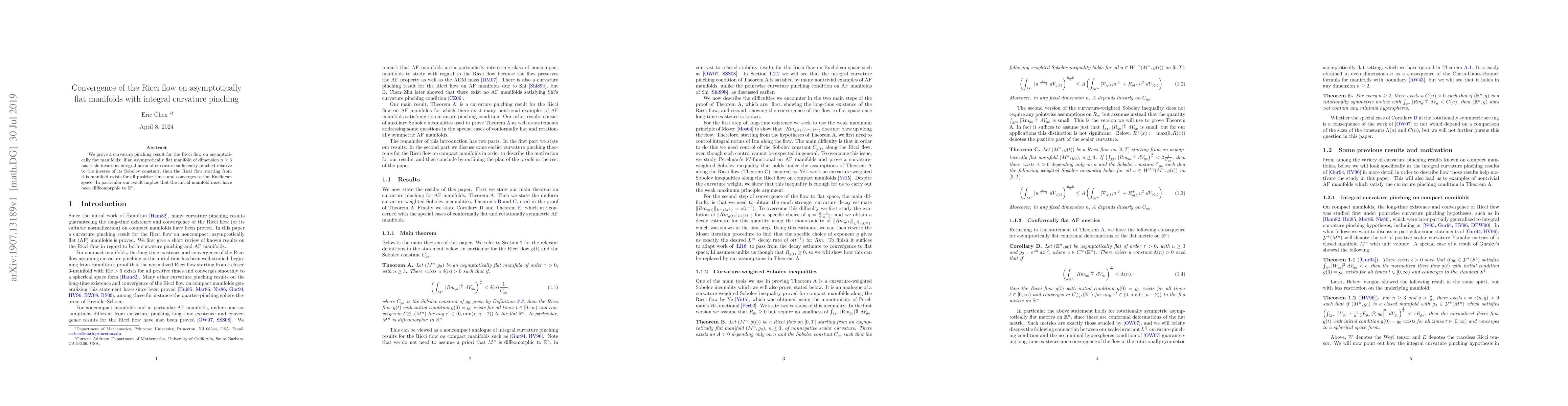 This paper proves that Ricci flow on asymptotically flat manifolds with sufficiently pinched integral curvature converges to flat Euclidean space, implying the initial manifold must be diffeomorphic to $\mathbb{R}^n$. The convergence is guaranteed for all positive times under the specified curvature condition.