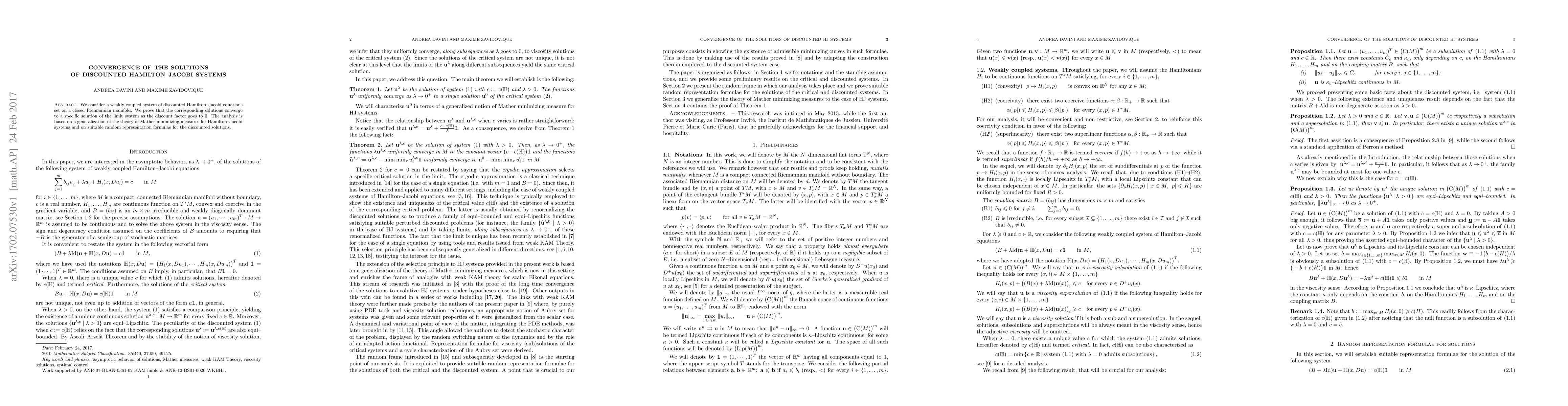 This paper investigates a weakly coupled system of discounted Hamilton--Jacobi equations on a closed Riemannian manifold, proving that the solutions converge to a specific limit as the discount factor approaches zero. The analysis leverages a generalized Mather minimizing measure theory and random representation formulas for discounted solutions.