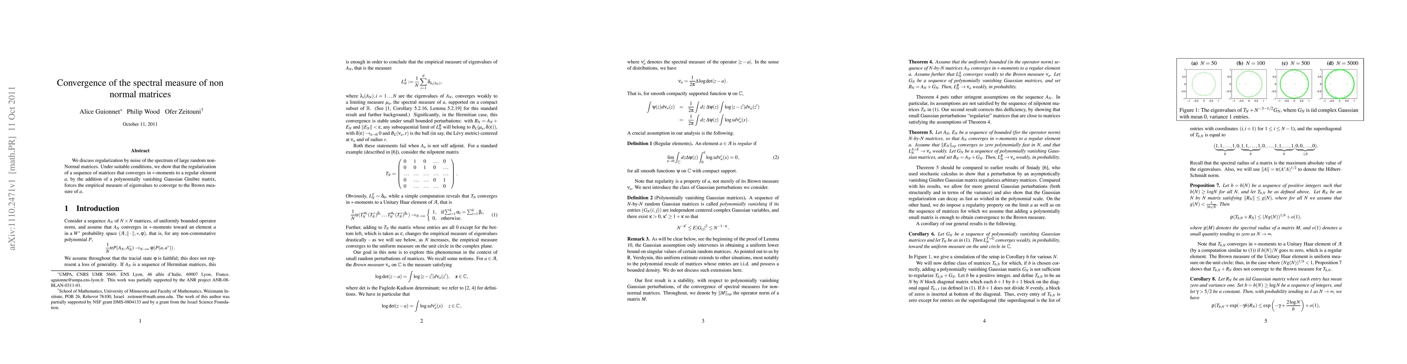 We discuss regularization by noise of the spectrum of large random non-Normal matrices. Under suitable conditions, we show that the regularization of a sequence of matrices that converges in *-moments to a regular element $a$, by the addition of a polynomially vanishing Gaussian Ginibre matrix, forces the empirical measure of eigenvalues to converge to the Brown measure of $a$.