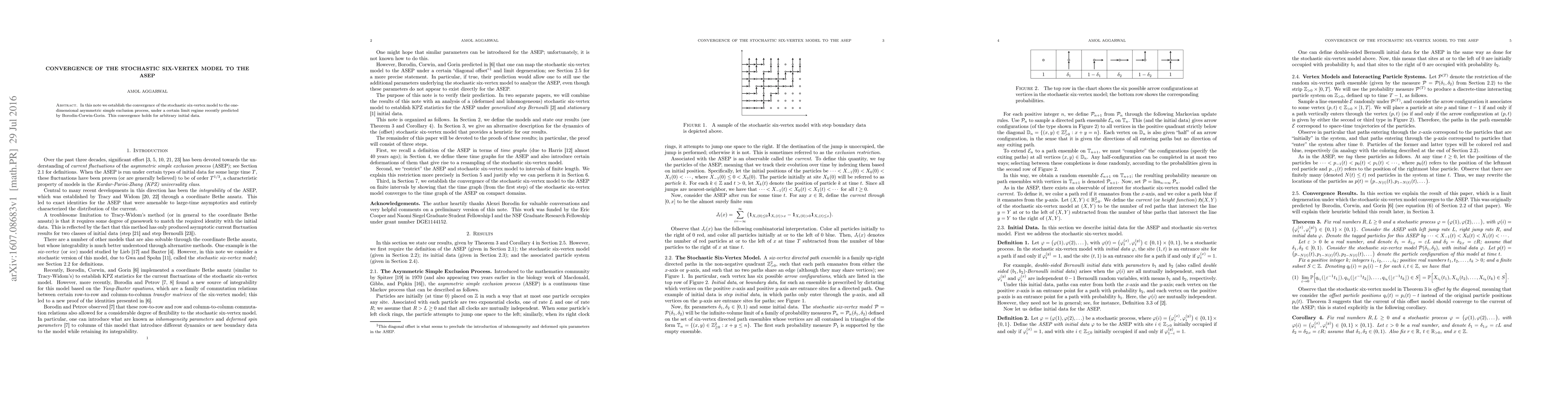 The paper demonstrates the convergence of the stochastic six-vertex model to the one-dimensional asymmetric simple exclusion process (ASEP) under a specific limit regime, showing that this holds true for any initial conditions. This result supports recent predictions by Borodin-Corwin-Gorin.