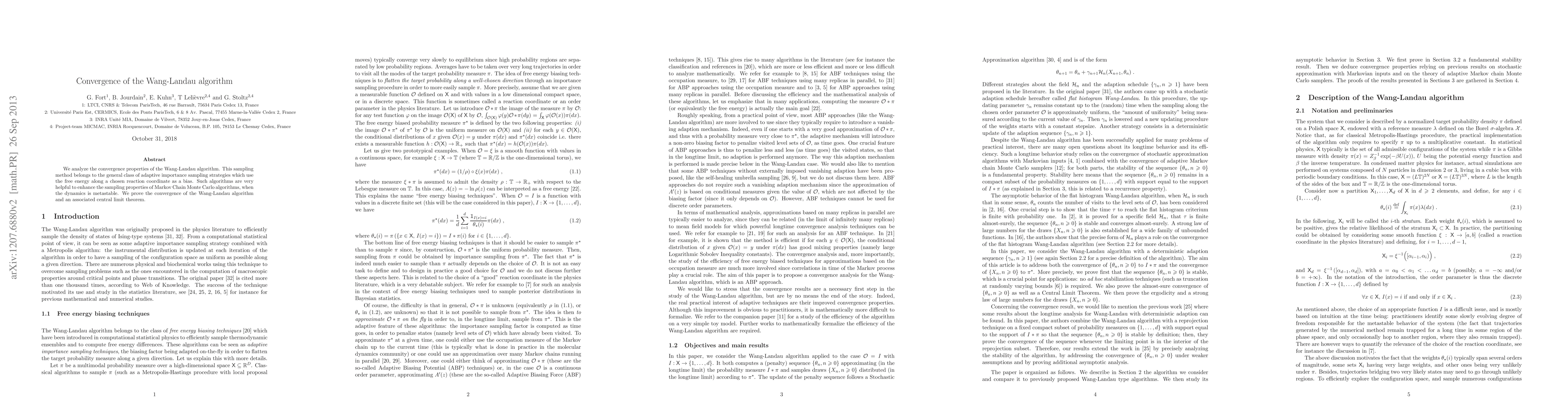 The Wang-Landau algorithm, an adaptive importance sampling method, is proven to converge and is shown to follow a central limit theorem, enhancing Markov Chain Monte Carlo algorithms for metastable dynamics.