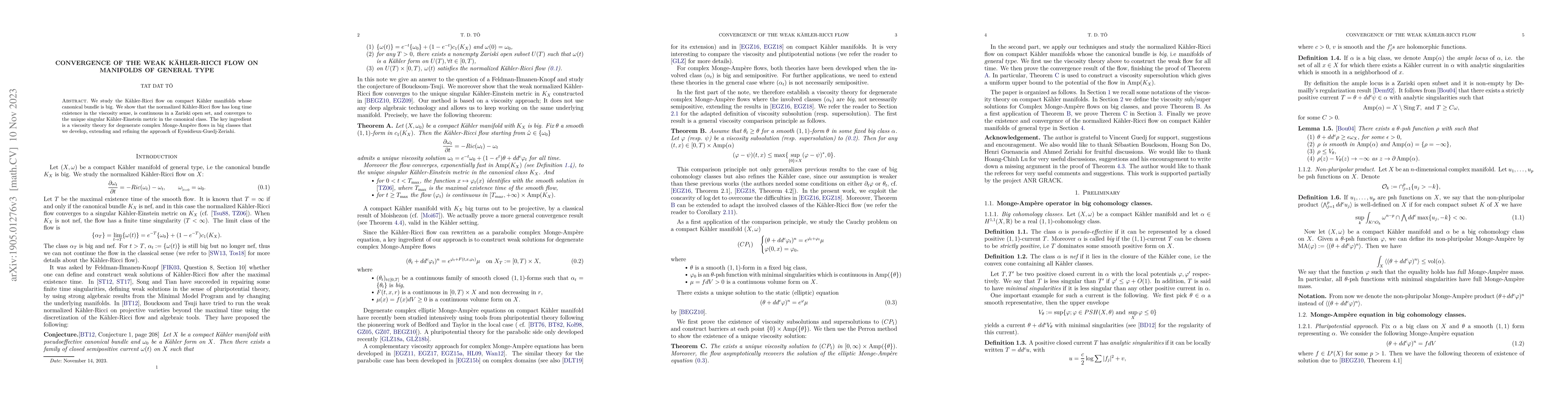 This paper demonstrates the long-time existence and convergence of the normalized Kähler-Ricci flow on compact Kähler manifolds with big canonical bundles, establishing continuity and convergence to a singular Kähler-Einstein metric, underpinned by a new viscosity theory for degenerate complex Monge-Ampère flows.