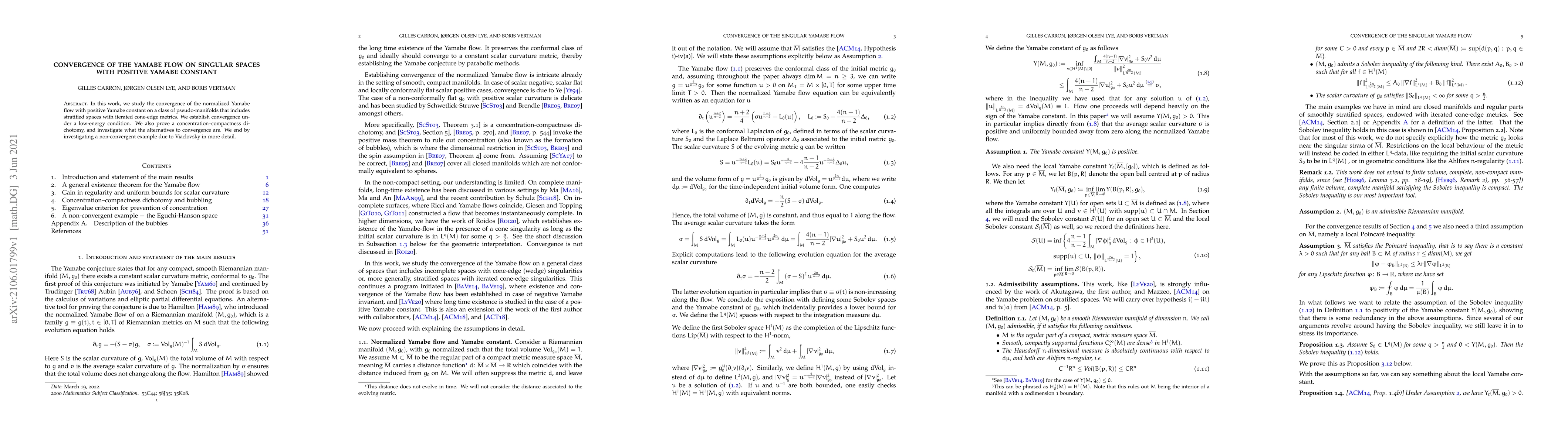 This paper examines the convergence of the normalized Yamabe flow on singular pseudo-manifolds with a positive Yamabe constant, proving convergence under low energy conditions and presenting a concentration-compactness dichotomy to explore alternative outcomes. It also delves into a non-convergent example from Viaclovsky.