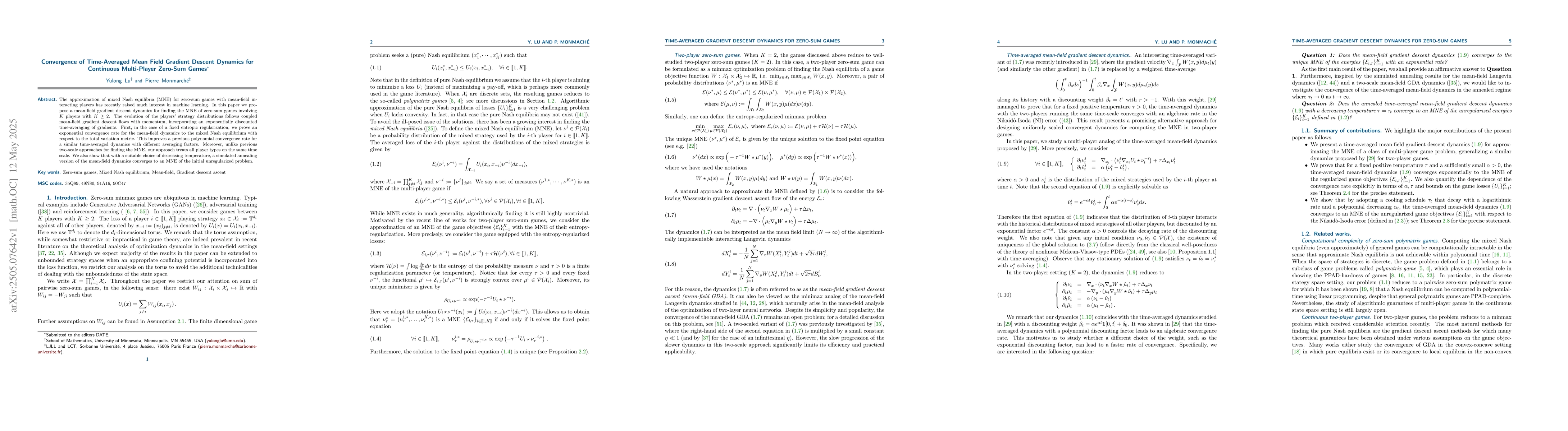 The paper proposes a mean-field gradient descent dynamics for finding mixed Nash equilibria (MNE) of zero-sum games involving K players, using coupled mean-field gradient descent flows with momentum and exponentially discounted time-averaging of gradients.