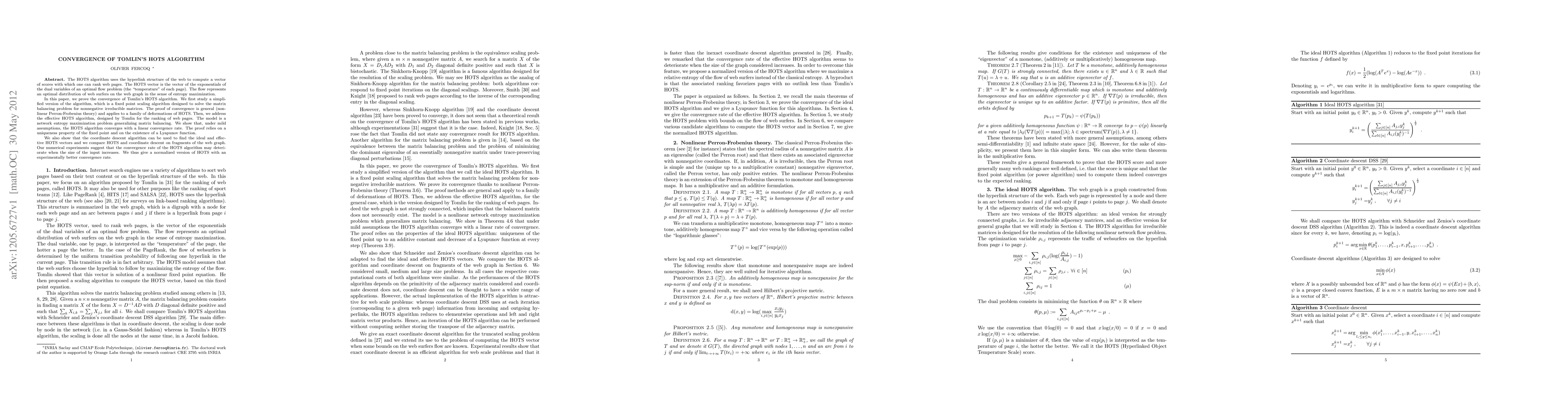The HOTS algorithm uses the hyperlink structure of the web to compute a vector of scores with which one can rank web pages. The HOTS vector is the vector of the exponentials of the dual variables of an optimal flow problem (the "temperature" of each page). The flow represents an optimal distribution of web surfers on the web graph in the sense of entropy maximization. In this paper, we prove the convergence of Tomlin's HOTS algorithm. We first study a simplified version of the algorithm, which is a fixed point scaling algorithm designed to solve the matrix balancing problem for nonnegative irreducible matrices. The proof of convergence is general (nonlinear Perron-Frobenius theory) and applies to a family of deformations of HOTS. Then, we address the effective HOTS algorithm, designed by Tomlin for the ranking of web pages. The model is a network entropy maximization problem generalizing matrix balancing. We show that, under mild assumptions, the HOTS algorithm converges with a linear convergence rate. The proof relies on a uniqueness property of the fixed point and on the existence of a Lyapunov function. We also show that the coordinate descent algorithm can be used to find the ideal and effective HOTS vectors and we compare HOTS and coordinate descent on fragments of the web graph. Our numerical experiments suggest that the convergence rate of the HOTS algorithm may deteriorate when the size of the input increases. We thus give a normalized version of HOTS with an experimentally better convergence rate.
