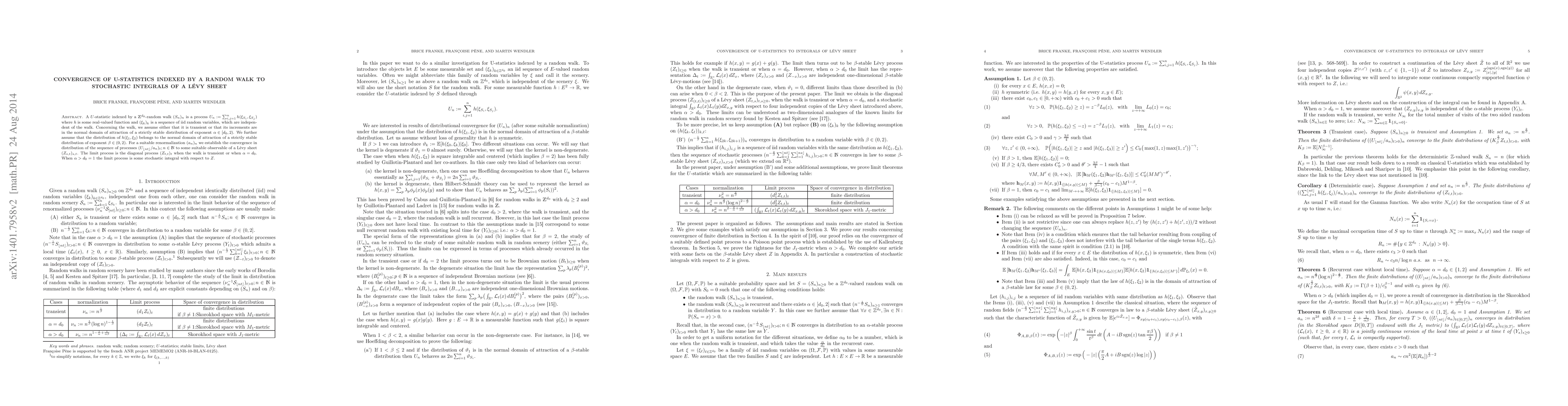 This paper establishes limit theorems for U-statistics indexed by a random walk on \( \mathbb{Z}^d \), showing convergence to stochastic integrals of a Lévy sheet \( Z(s,t) \). The limit process depends on the recurrence properties of the random walk, with transient or null-recurrent walks converging to \( Z(t,t) \) and positive recurrent walks converging to a stochastic integral with respect to \( Z \).