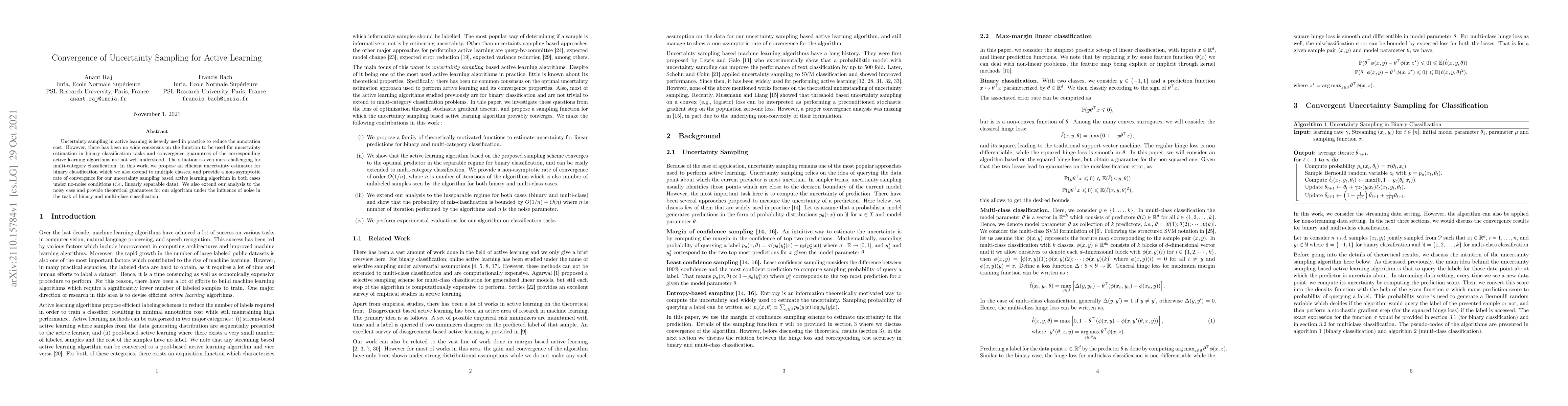 Uncertainty sampling in active learning is heavily used in practice to reduce the annotation cost. However, there has been no wide consensus on the function to be used for uncertainty estimation in binary classification tasks and convergence guarantees of the corresponding active learning algorithms are not well understood. The situation is even more challenging for multi-category classification. In this work, we propose an efficient uncertainty estimator for binary classification which we also extend to multiple classes, and provide a non-asymptotic rate of convergence for our uncertainty sampling-based active learning algorithm in both cases under no-noise conditions (i.e., linearly separable data). We also extend our analysis to the noisy case and provide theoretical guarantees for our algorithm under the influence of noise in the task of binary and multi-class classification.