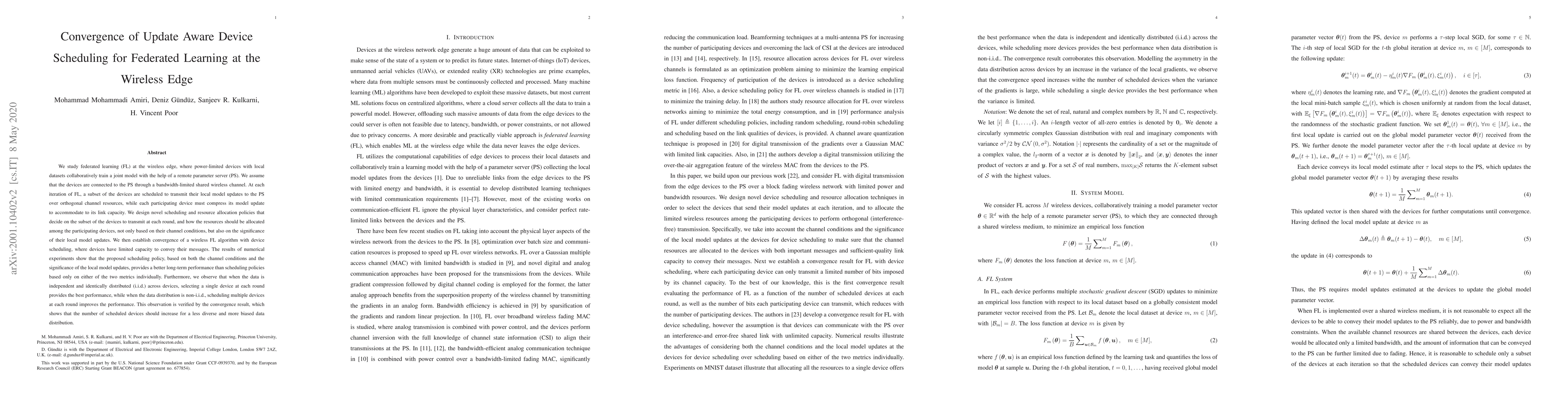 We study federated learning (FL) at the wireless edge, where power-limited devices with local datasets collaboratively train a joint model with the help of a remote parameter server (PS). We assume that the devices are connected to the PS through a bandwidth-limited shared wireless channel. At each iteration of FL, a subset of the devices are scheduled to transmit their local model updates to the PS over orthogonal channel resources, while each participating device must compress its model update to accommodate to its link capacity. We design novel scheduling and resource allocation policies that decide on the subset of the devices to transmit at each round, and how the resources should be allocated among the participating devices, not only based on their channel conditions, but also on the significance of their local model updates. We then establish convergence of a wireless FL algorithm with device scheduling, where devices have limited capacity to convey their messages. The results of numerical experiments show that the proposed scheduling policy, based on both the channel conditions and the significance of the local model updates, provides a better long-term performance than scheduling policies based only on either of the two metrics individually. Furthermore, we observe that when the data is independent and identically distributed (i.i.d.) across devices, selecting a single device at each round provides the best performance, while when the data distribution is non-i.i.d., scheduling multiple devices at each round improves the performance. This observation is verified by the convergence result, which shows that the number of scheduled devices should increase for a less diverse and more biased data distribution.