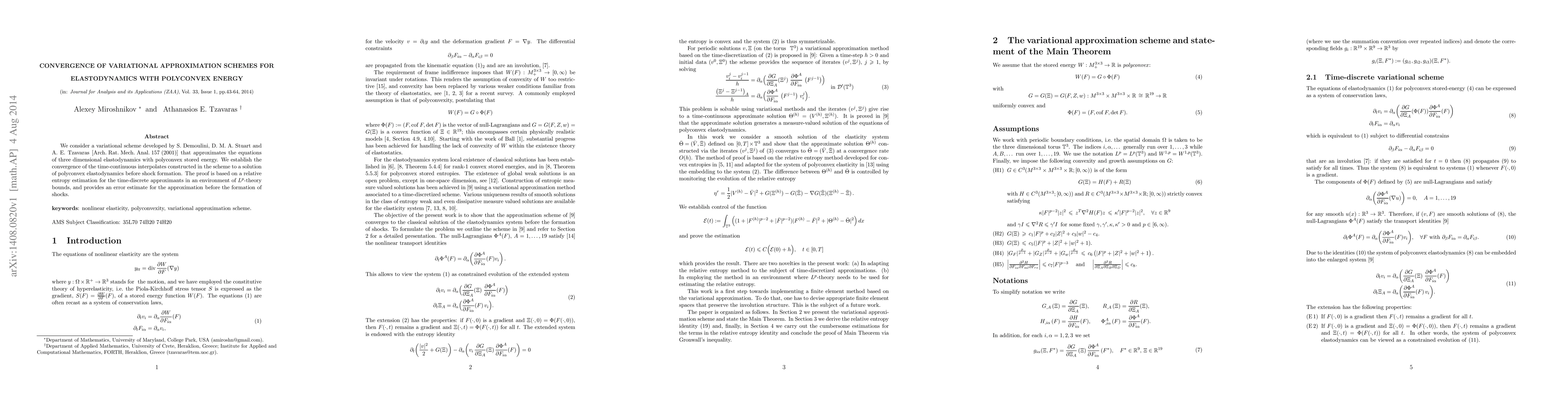 This paper establishes the convergence of a variational scheme to approximate three-dimensional elastodynamics with polyconvex energy, showing that time-continuous interpolates converge to a solution before shock formation. The proof utilizes relative entropy estimation and Lp-theory bounds to provide an error estimate.