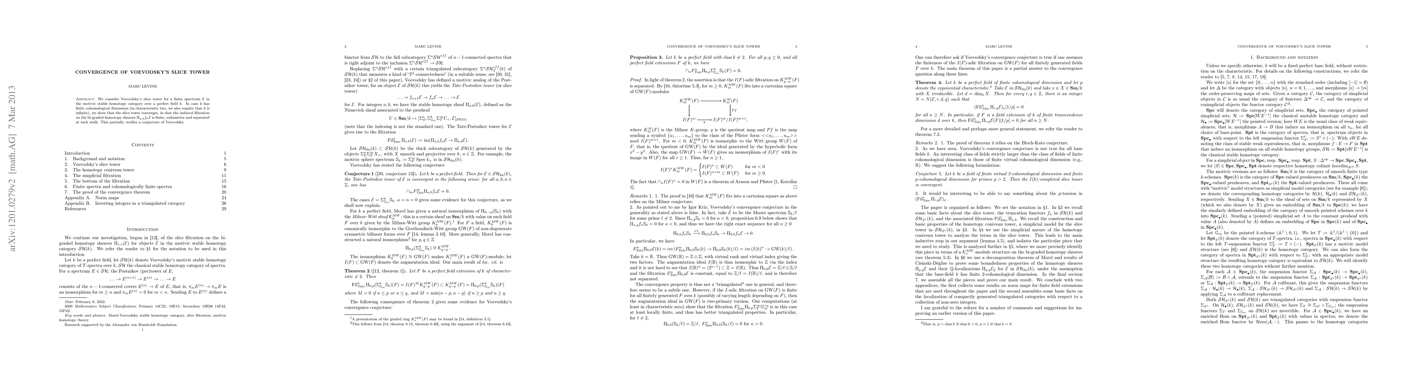 This paper demonstrates the convergence of Voevodsky's slice tower for finite spectra in the motivic stable homotopy category over perfect fields, verifying a part of Voevodsky's conjecture under specific conditions on the field's cohomological dimension. The convergence is shown through a finite, exhaustive, and separated filtration at each stalk.