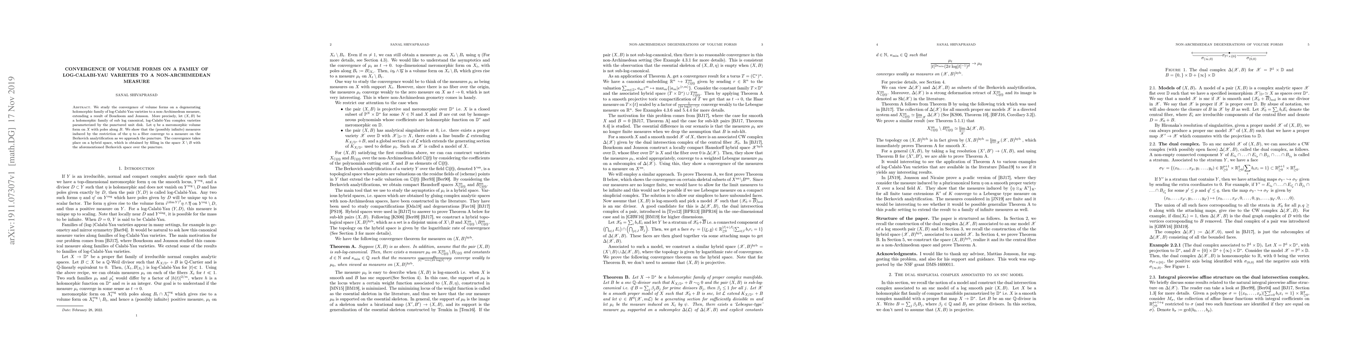 This paper investigates the convergence of volume forms on a degenerating family of log-Calabi-Yau varieties to a non-Archimedean measure, extending prior results. It demonstrates that measures induced by meromorphic volume forms converge to a measure on the Berkovich analytification as one approaches the puncture, within a hybrid space filling in the complement of the boundary.
