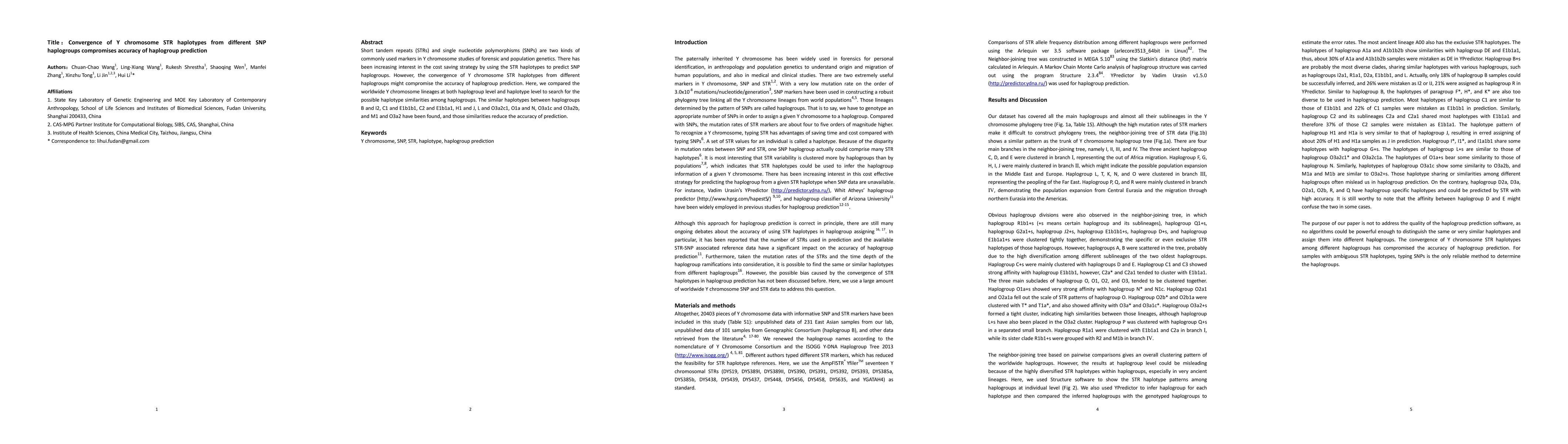 Short tandem repeats (STRs) and single nucleotide polymorphisms (SNPs) are two kinds of commonly used markers in Y chromosome studies of forensic and population genetics. There has been increasing interest in the cost saving strategy by using the STR haplotypes to predict SNP haplogroups. However, the convergence of Y chromosome STR haplotypes from different haplogroups might compromise the accuracy of haplogroup prediction. Here, we compared the worldwide Y chromosome lineages at both haplogroup level and haplotype level to search for the possible haplotype similarities among haplogroups. The similar haplotypes between haplogroups B and I2, C1 and E1b1b1, C2 and E1b1a1, H1 and J, L and O3a2c1, O1a and N, O3a1c and O3a2b, and M1 and O3a2 have been found, and those similarities reduce the accuracy of prediction.