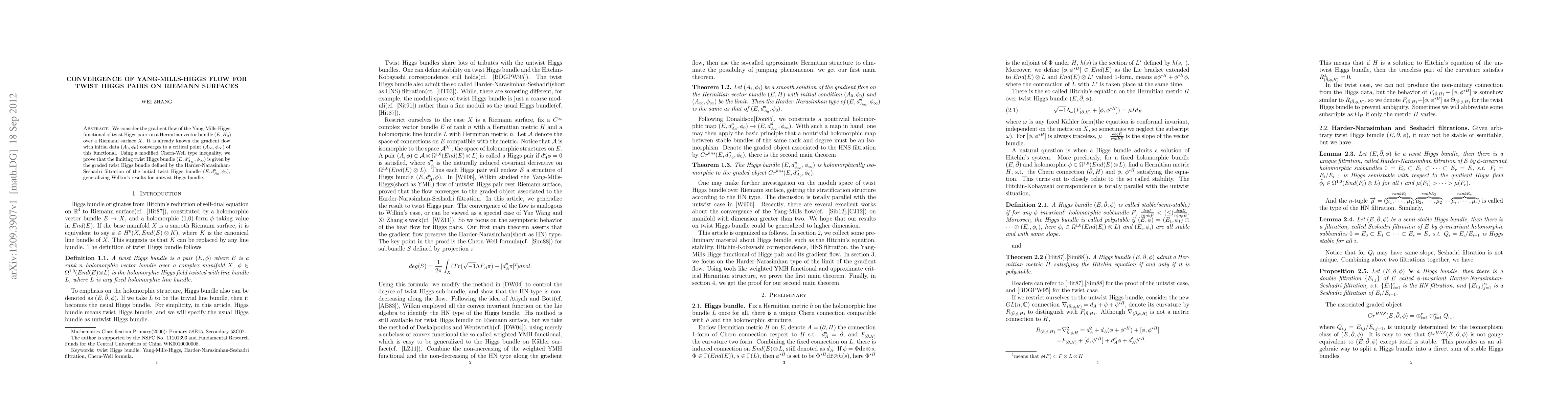 We consider the gradient flow of the Yang-Mills-Higgs functional of twist Higgs pairs on a Hermitian vector bundle $(E,H_0)$ over a Riemann surface $X$. It is already known the gradient flow with initial data $(A_0,\phi_0)$ converges to a critical point $(A_\infty, \phi_\infty)$ of this functional. Using a modified Chern-Weil type inequality, we prove that the limiting twist Higgs bundle $(E, d_{A_\infty}", \phi_\infty)$ is given by the graded twist Higgs bundle defined by the Harder-Narasimhan-Seshadri filtration of the initial twist Higgs bundle $(E,d_{A_0}",\phi_0)$, generalizing Wilkin's results for untwist Higgs bundle.