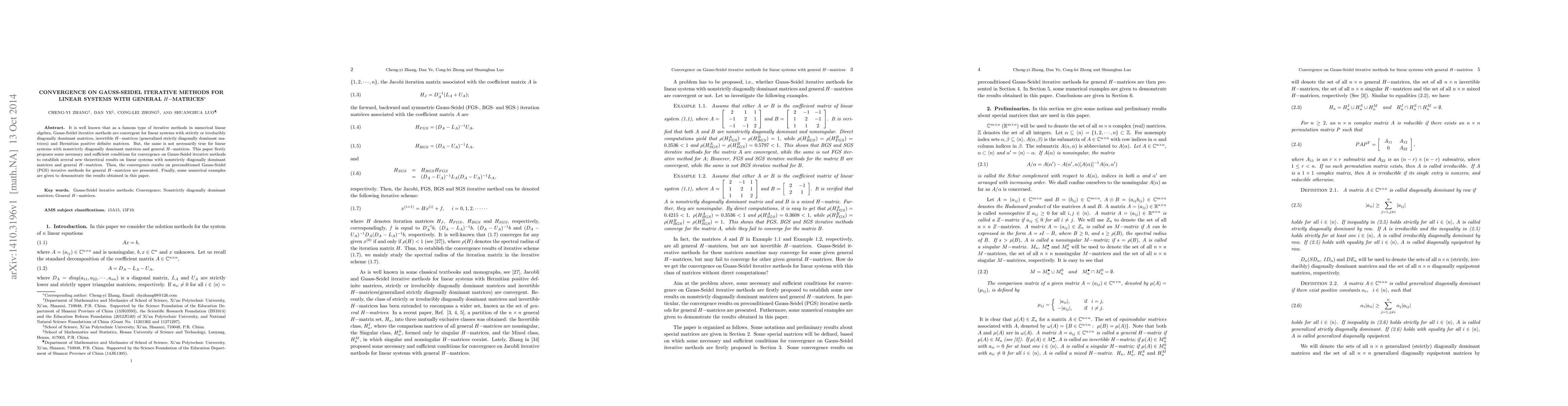 This paper proposes new necessary and sufficient conditions for the convergence of Gauss-Seidel iterative methods for linear systems with nonstrictly diagonally dominant matrices and general $H-$matrices. It also presents convergence results for preconditioned Gauss-Seidel methods and provides numerical examples to validate the theoretical findings.