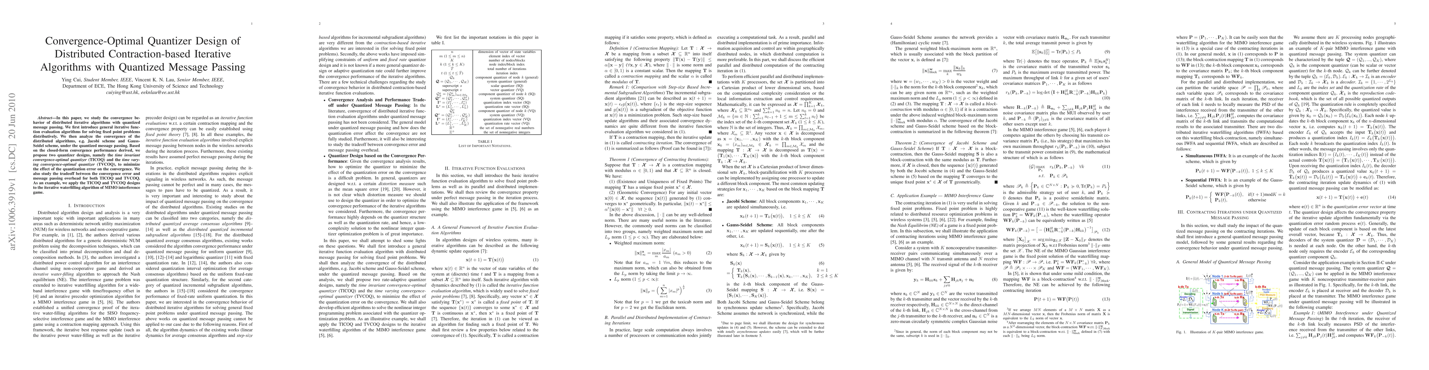 This paper investigates the convergence of distributed iterative algorithms with quantized message passing, proposing two convergence-optimal quantizer designs (TICOQ and TVCOQ) to minimize quantization error effects. It also examines the trade-off between convergence error and communication overhead, demonstrating the approach with an iterative waterfilling algorithm for MIMO interference games.