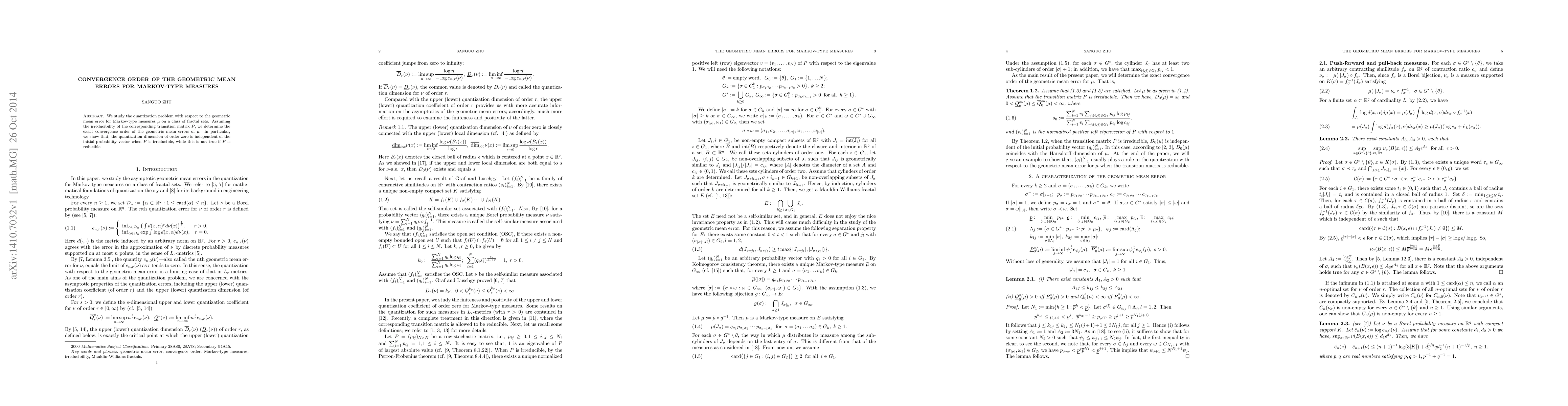 The paper studies the convergence order of geometric mean errors for Markov-type measures on fractal sets, finding that quantization dimension of order zero is independent of initial probability when the transition matrix is irreducible.