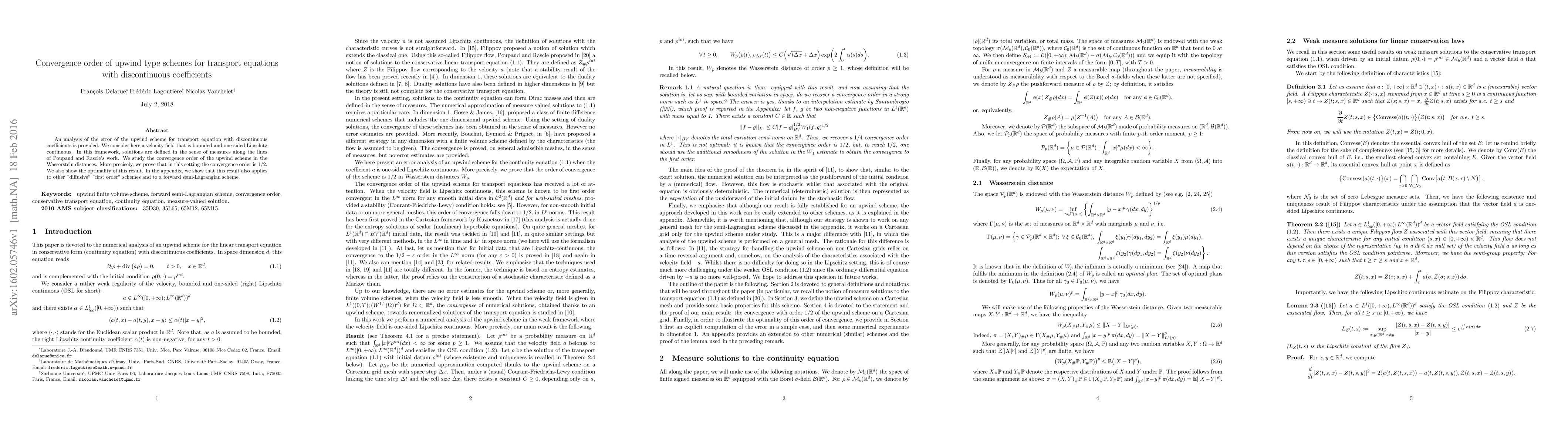 An analysis of the error of the upwind scheme for transport equation with discontinuous coefficients is provided. We consider here a velocity field that is bounded and one-sided Lipschitz continuous. In this framework, solutions are defined in the sense of measures along the lines of Poupaud and Rascle's work. We study the convergence order of the upwind scheme in the Wasserstein distances. More precisely, we prove that in this setting the convergence order is 1/2. We also show the optimality of this result. In the appendix, we show that this result also applies to other "diffusive" "first order" schemes and to a forward semi-Lagrangian scheme.