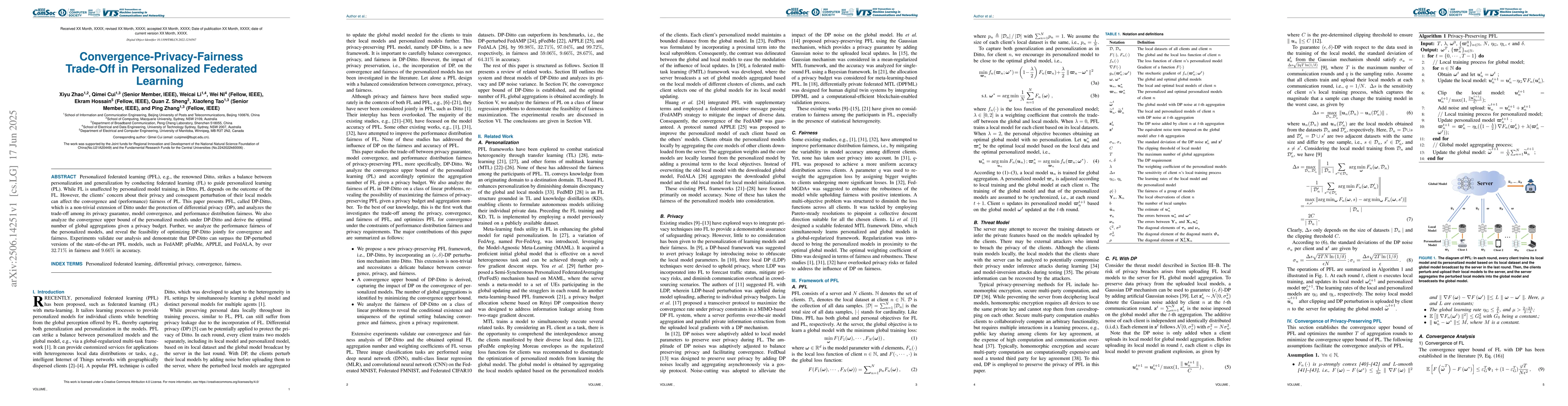 Personalized federated learning (PFL), e.g., the renowned Ditto, strikes a balance between personalization and generalization by conducting federated learning (FL) to guide personalized learning (PL). While FL is unaffected by personalized model training, in Ditto, PL depends on the outcome of the FL. However, the clients' concern about their privacy and consequent perturbation of their local models can affect the convergence and (performance) fairness of PL. This paper presents PFL, called DP-Ditto, which is a non-trivial extension of Ditto under the protection of differential privacy (DP), and analyzes the trade-off among its privacy guarantee, model convergence, and performance distribution fairness. We also analyze the convergence upper bound of the personalized models under DP-Ditto and derive the optimal number of global aggregations given a privacy budget. Further, we analyze the performance fairness of the personalized models, and reveal the feasibility of optimizing DP-Ditto jointly for convergence and fairness. Experiments validate our analysis and demonstrate that DP-Ditto can surpass the DP-perturbed versions of the state-of-the-art PFL models, such as FedAMP, pFedMe, APPLE, and FedALA, by over 32.71% in fairness and 9.66% in accuracy.