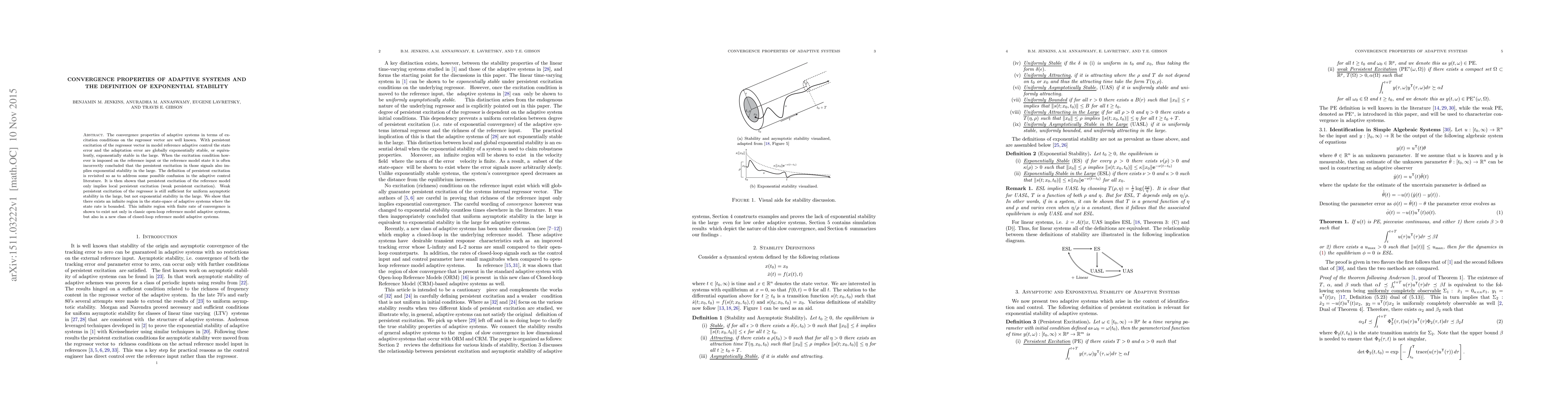This paper examines the convergence properties of adaptive systems, clarifying the conditions under which exponential stability in the large can be achieved. It corrects misconceptions regarding persistent excitation applied to reference inputs or models, showing that while weak persistent excitation suffices for uniform asymptotic stability, it does not guarantee exponential stability in the large.