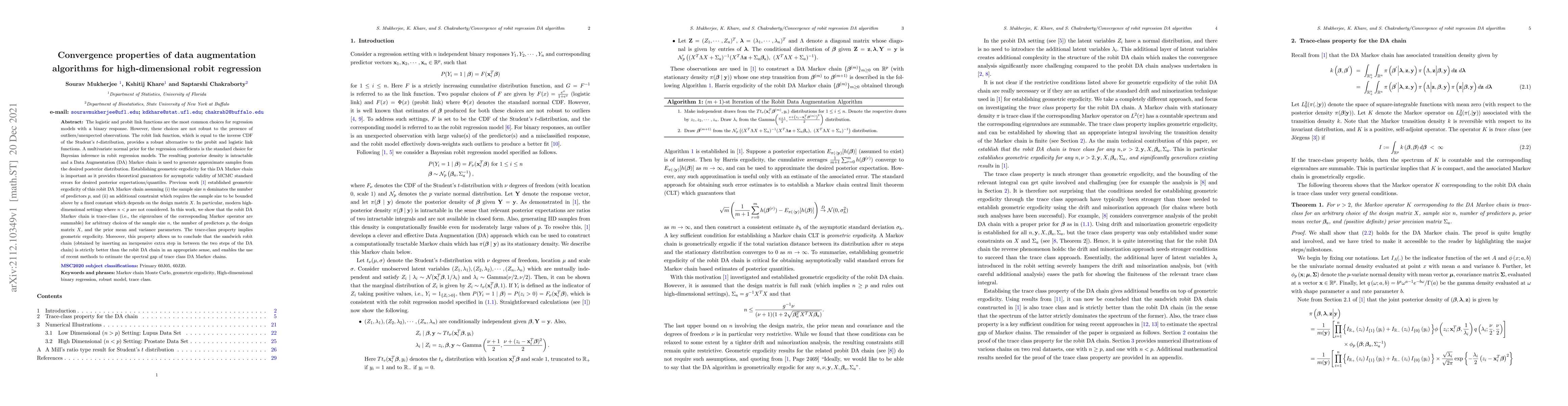 The logistic and probit link functions are the most common choices for regression models with a binary response. However, these choices are not robust to the presence of outliers/unexpected observations. The robit link function, which is equal to the inverse CDF of the Student's $t$-distribution, provides a robust alternative to the probit and logistic link functions. A multivariate normal prior for the regression coefficients is the standard choice for Bayesian inference in robit regression models. The resulting posterior density is intractable and a Data Augmentation (DA) Markov chain is used to generate approximate samples from the desired posterior distribution. Establishing geometric ergodicity for this DA Markov chain is important as it provides theoretical guarantees for asymptotic validity of MCMC standard errors for desired posterior expectations/quantiles. Previous work [Roy(2012)] established geometric ergodicity of this robit DA Markov chain assuming (i) the sample size $n$ dominates the number of predictors $p$, and (ii) an additional constraint which requires the sample size to be bounded above by a fixed constant which depends on the design matrix $X$. In particular, modern high-dimensional settings where $n < p$ are not considered. In this work, we show that the robit DA Markov chain is trace-class (i.e., the eigenvalues of the corresponding Markov operator are summable) for arbitrary choices of the sample size $n$, the number of predictors $p$, the design matrix $X$, and the prior mean and variance parameters. The trace-class property implies geometric ergodicity. Moreover, this property allows us to conclude that the sandwich robit chain (obtained by inserting an inexpensive extra step in between the two steps of the DA chain) is strictly better than the robit DA chain in an appropriate sense.