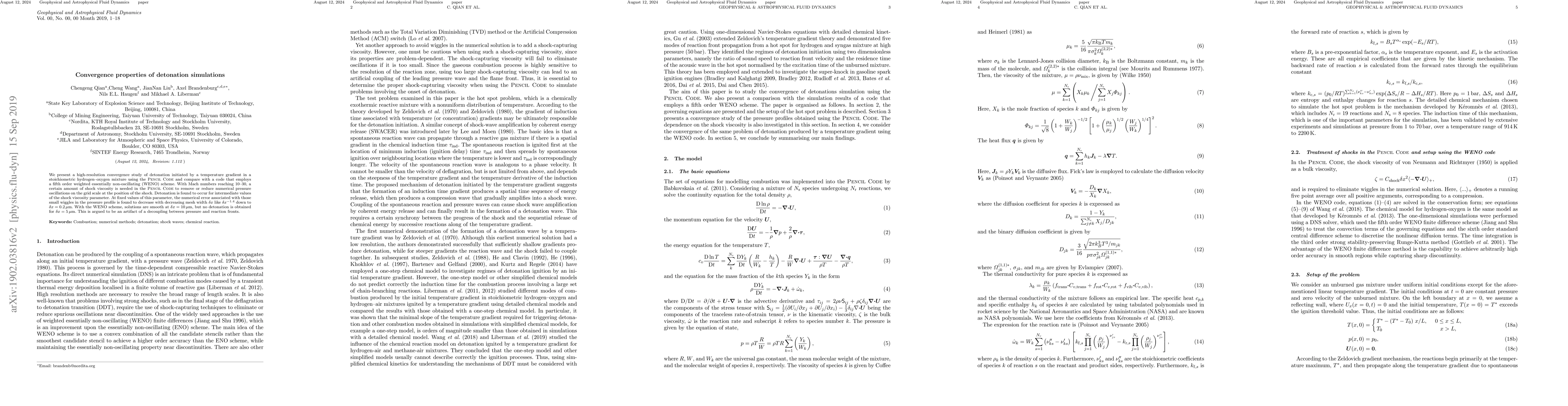 This study investigates the convergence properties of high-resolution detonation simulations in a hydrogen-oxygen mixture using two different numerical methods. The Pencil Code requires shock viscosity to mitigate numerical oscillations, while the WENO scheme achieves smooth solutions without detonation at finer resolutions, suggesting a decoupling issue.