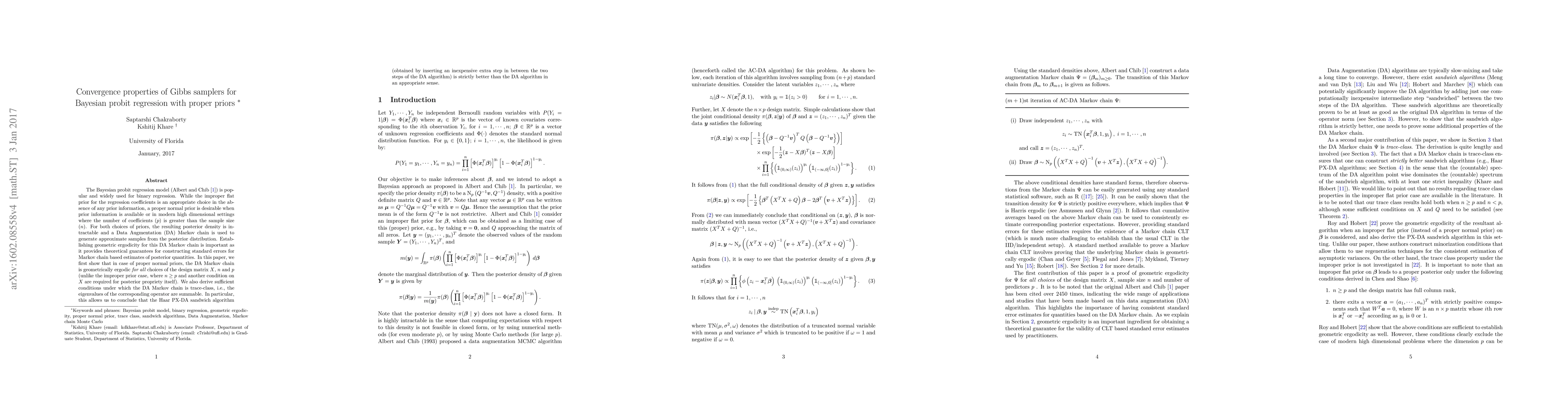 This paper establishes geometric ergodicity for the Gibbs sampler used in Bayesian probit regression with proper normal priors, showing it holds for all design matrices, sample sizes, and dimensions. It also derives conditions for trace-class properties, demonstrating the superiority of the Haar PX-DA sandwich algorithm over the standard DA algorithm.