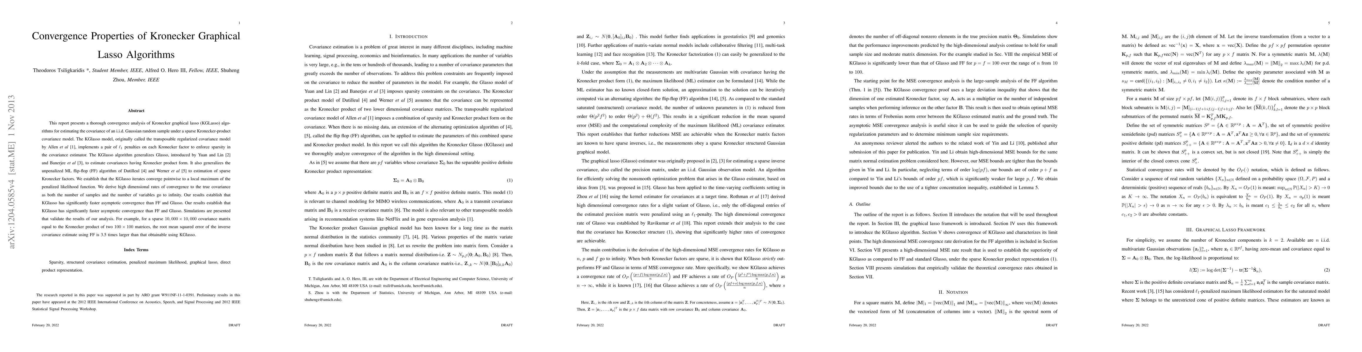 This paper studies iteration convergence of Kronecker graphical lasso (KGLasso) algorithms for estimating the covariance of an i.i.d. Gaussian random sample under a sparse Kronecker-product covariance model and MSE convergence rates. The KGlasso model, originally called the transposable regularized covariance model by Allen ["Transposable regularized covariance models with an application to missing data imputation," Ann. Appl. Statist., vol. 4, no. 2, pp. 764-790, 2010], implements a pair of $\ell_1$ penalties on each Kronecker factor to enforce sparsity in the covariance estimator. The KGlasso algorithm generalizes Glasso, introduced by Yuan and Lin ["Model selection and estimation in the Gaussian graphical model," Biometrika, vol. 94, pp. 19-35, 2007] and Banerjee ["Model selection through sparse maximum likelihood estimation for multivariate Gaussian or binary data," J. Mach. Learn. Res., vol. 9, pp. 485-516, Mar. 2008], to estimate covariances having Kronecker product form. It also generalizes the unpenalized ML flip-flop (FF) algorithm of Dutilleul ["The MLE algorithm for the matrix normal distribution," J. Statist. Comput. Simul., vol. 64, pp. 105-123, 1999] and Werner ["On estimation of covariance matrices with Kronecker product structure," IEEE Trans. Signal Process., vol. 56, no. 2, pp. 478-491, Feb. 2008] to estimation of sparse Kronecker factors. We establish that the KGlasso iterates converge pointwise to a local maximum of the penalized likelihood function. We derive high dimensional rates of convergence to the true covariance as both the number of samples and the number of variables go to infinity. Our results establish that KGlasso has significantly faster asymptotic convergence than Glasso and FF. Simulations are presented that validate the results of our analysis.