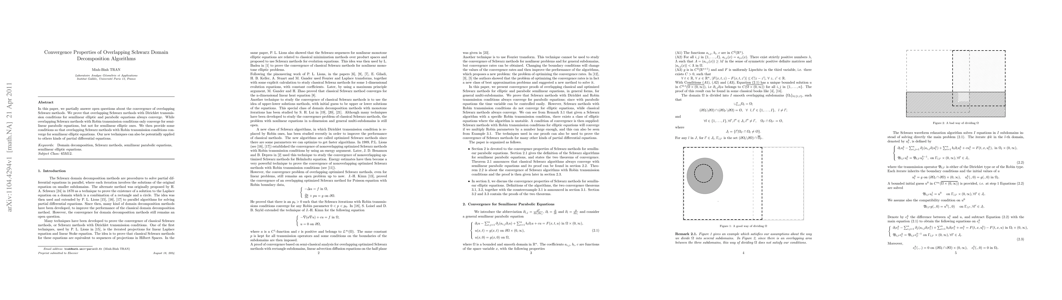 This paper investigates the convergence properties of overlapping Schwarz domain decomposition methods for semilinear elliptic and parabolic equations. It proves convergence for overlapping Schwarz methods with Dirichlet conditions and provides conditions for convergence with Robin conditions for semilinear elliptic equations.