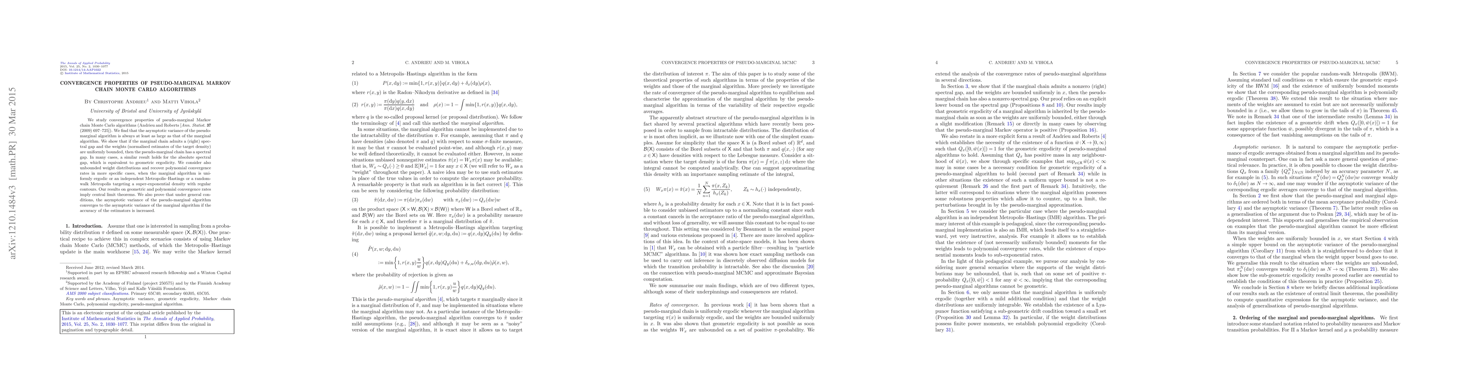 This paper investigates the convergence properties of pseudo-marginal Markov chain Monte Carlo algorithms, demonstrating that their asymptotic variance is at least as large as that of marginal algorithms. It shows that under certain conditions, the pseudo-marginal chain exhibits spectral gaps and geometric ergodicity, leading to central limit theorems and polynomial convergence rates in specific scenarios.